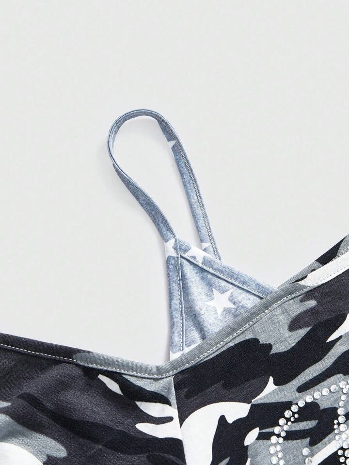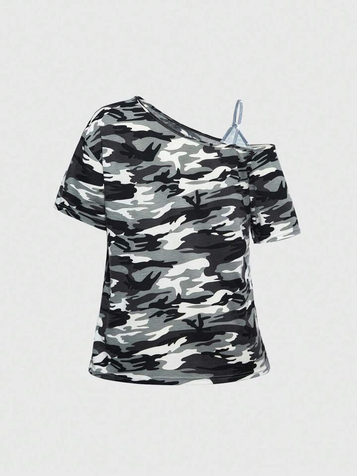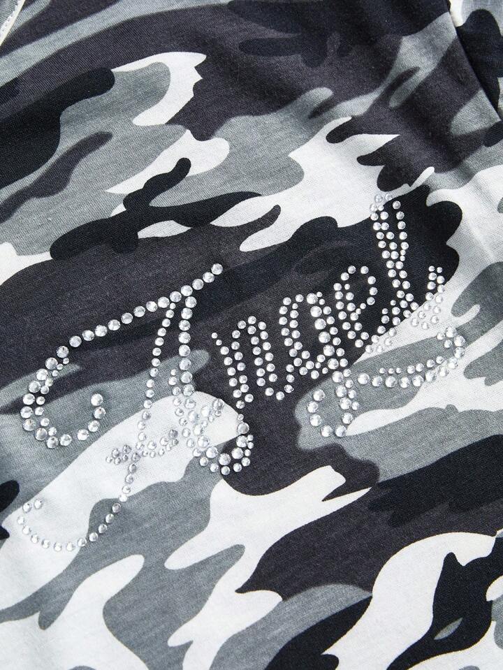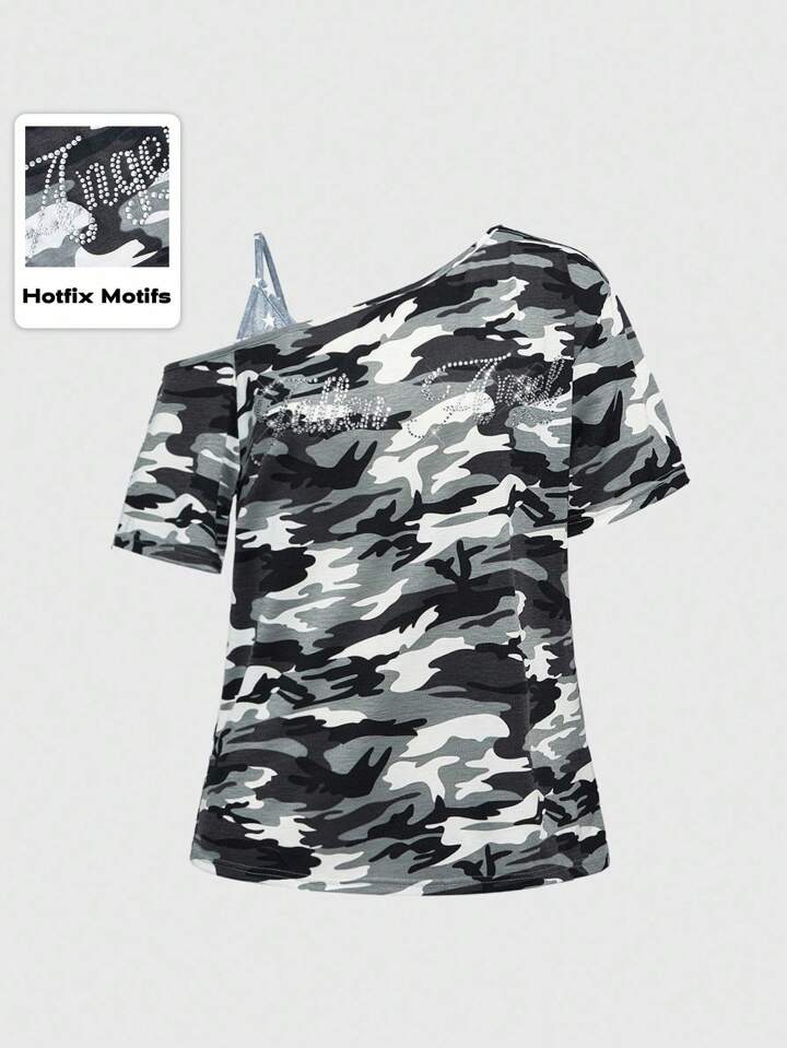 Grunge Punk Maglietta/camicetta da donna in stile gotico, con stampa mimetica, impreziosita da strass, collo obliquo, modello loose e 2 in 1