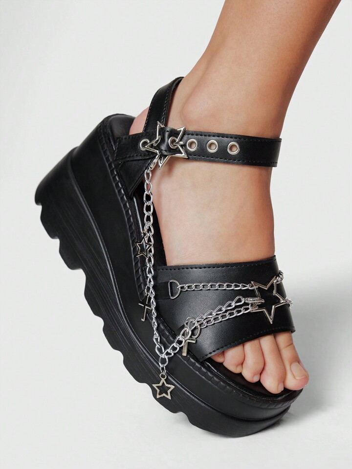 Grunge Punk Sandali neri da donna stile punk rock e gotico, sandali estivi con punta aperta, catena, stile romano, per abiti da festa, sandali con zeppa e platform a stella