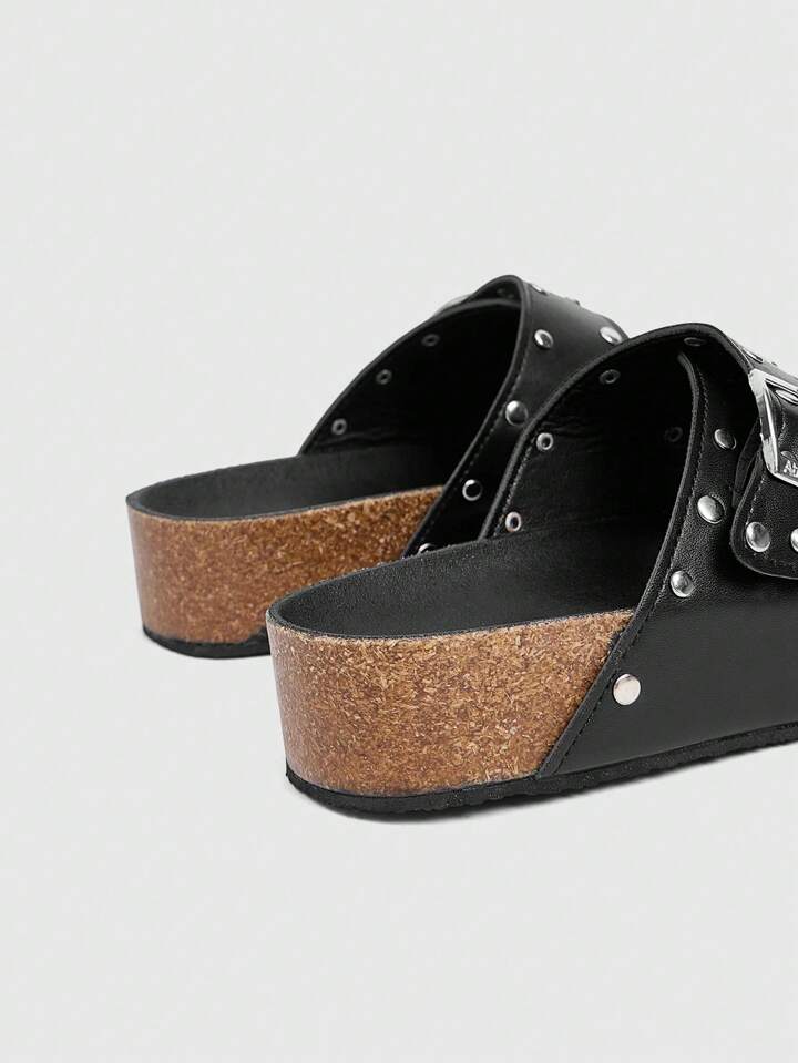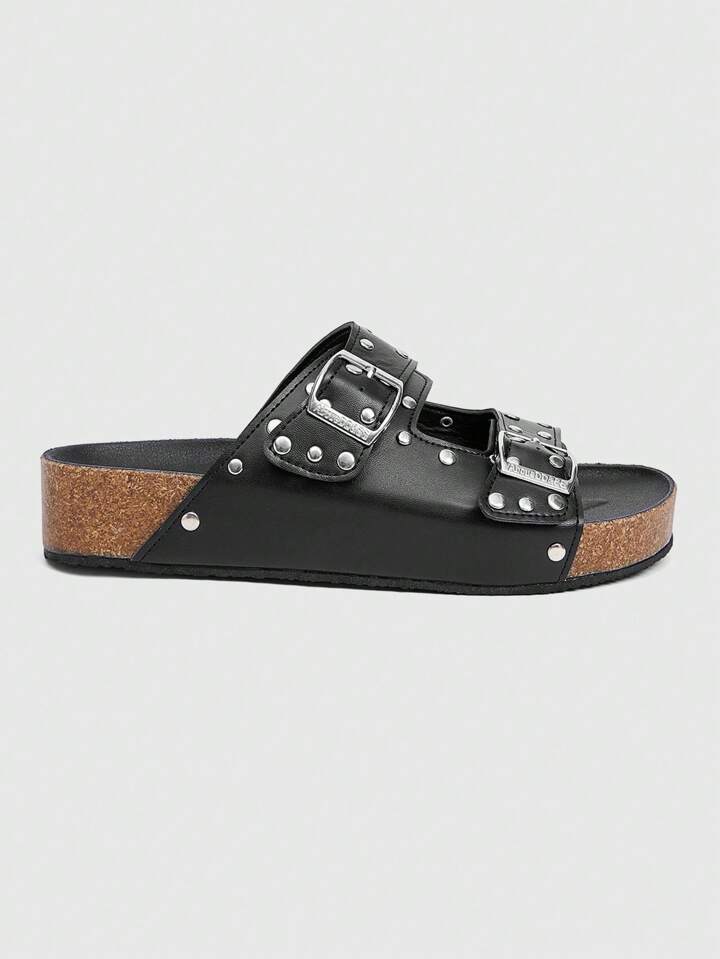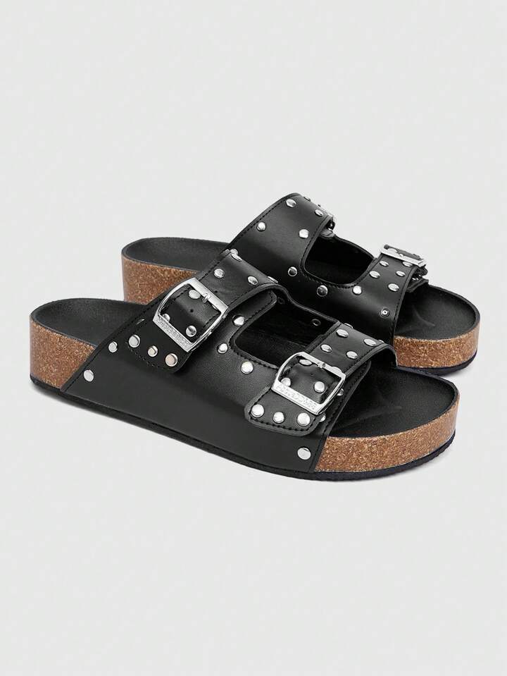 Grunge Punk Sandali da donna neri di stile romano per la spiaggia, sandali piatti estivi da vacanza con cinturino a fibbia e punta aperta