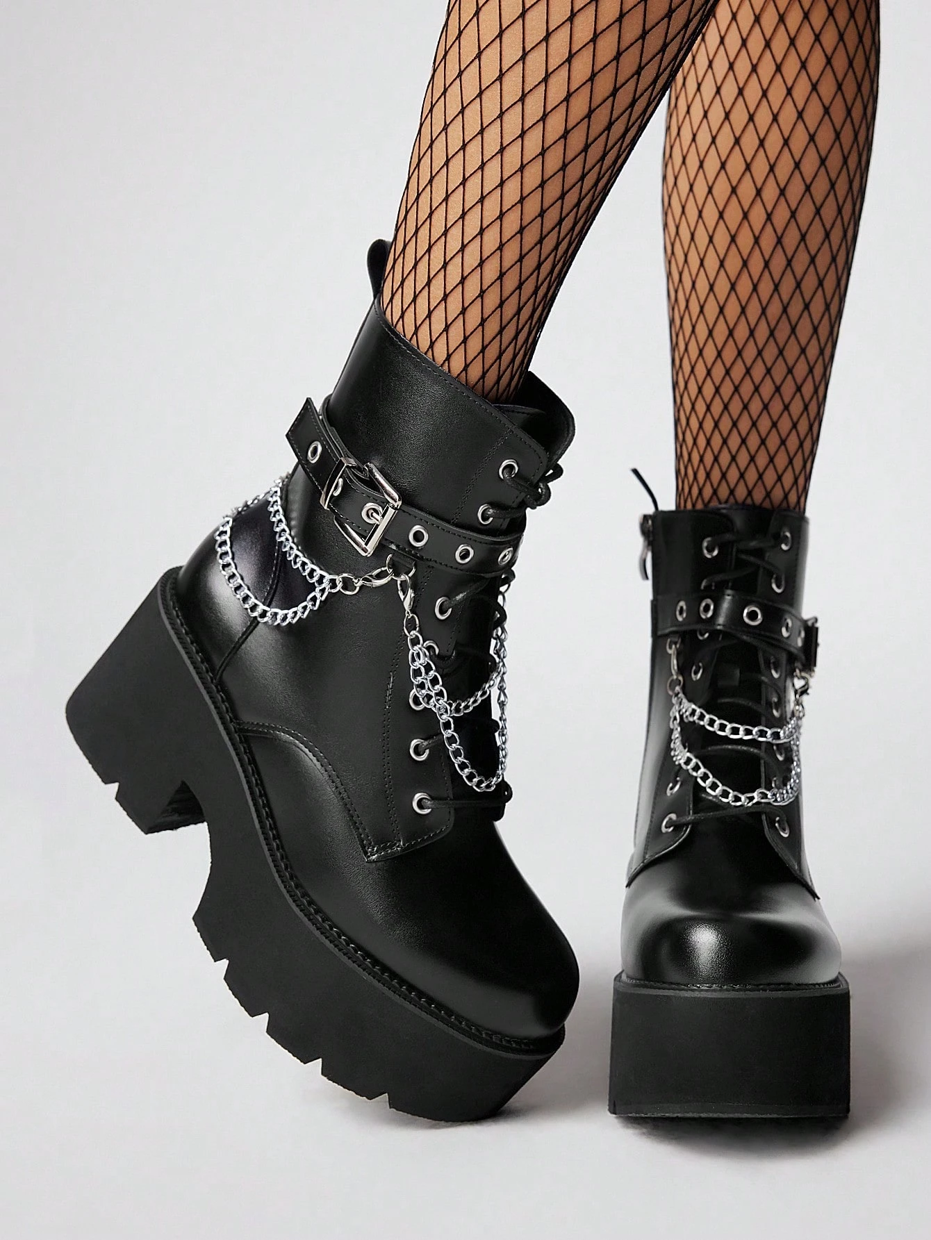 Grunge Punk Stivali corti da donna stile punk scuro con suola spessa e tacco chunky, stivali alla caviglia con decorazione a catena metallica gotica e zeppa, comodi stivali da combattimento, adatti per Ognissanti