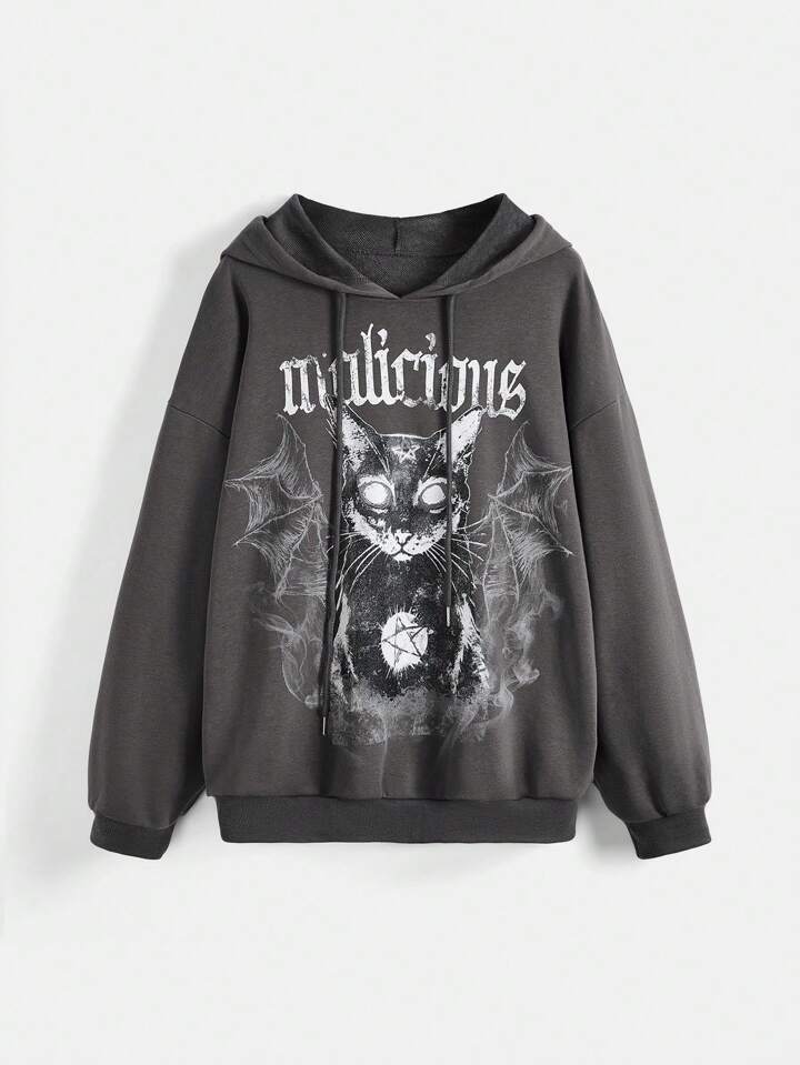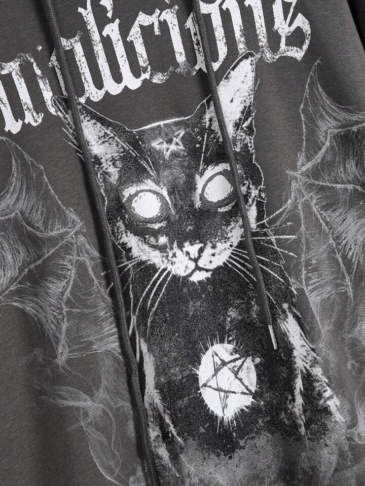 Grunge Punk Felpa con cappuccio con grafica di gatti neri e pipistrelli a spalle scoperte con maniche lunghe e coulisse, per autunno/inverno