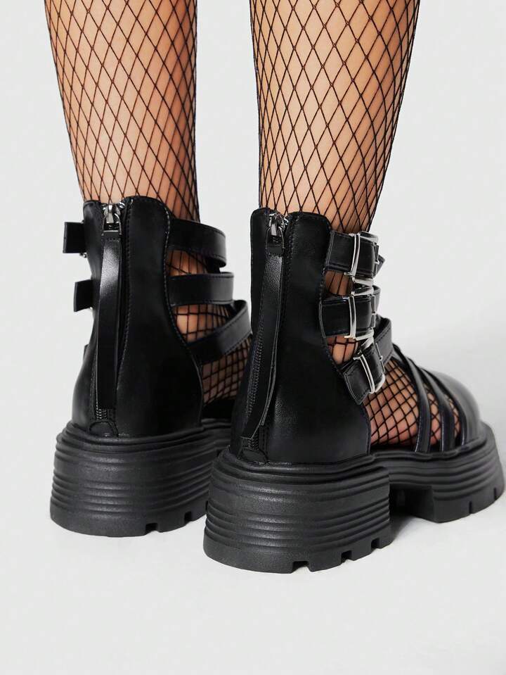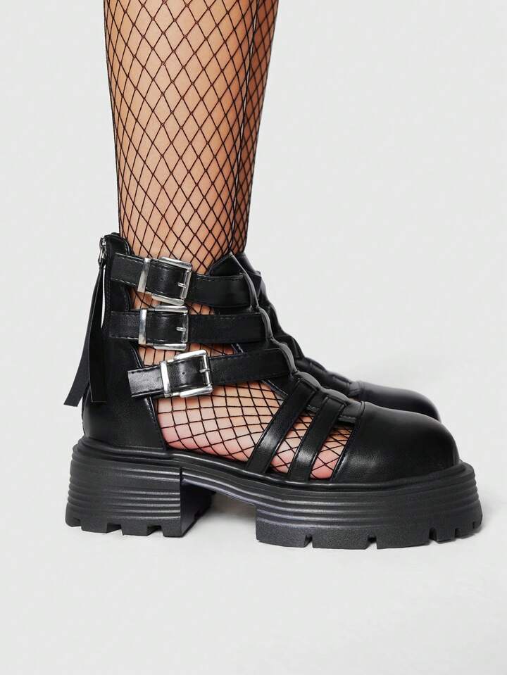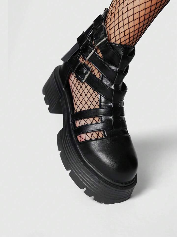 Grunge Punk Scarpe con tacco a piattaforma e zeppa, con design a fibbia traforato, di moda per donne