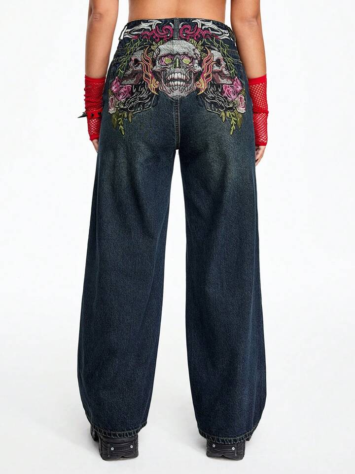Grunge Punk Jeans moda a gamba larga e vestibilità ampia con stampa di fiori e teschi per le donne con tasche