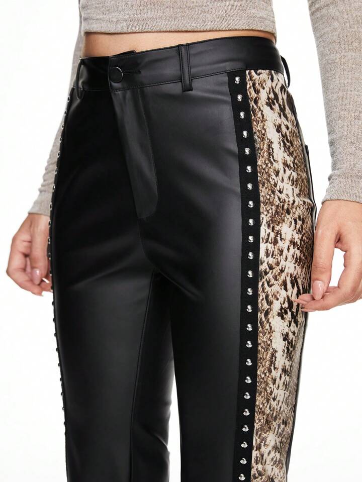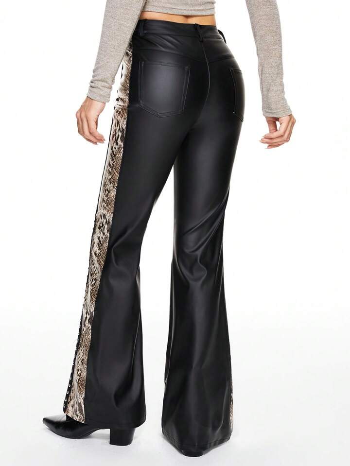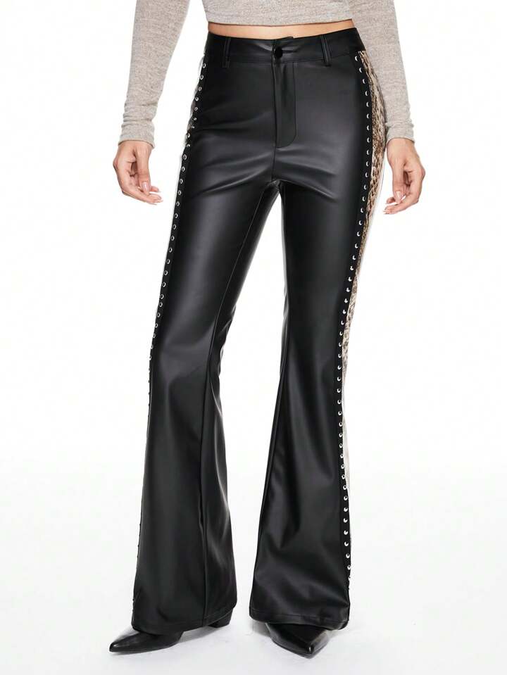 Grunge Punk Pantaloni a vita bassa aderenti per donne, in pelle sintetica PU con stampa a pelle di serpente, design con toppe e borchie, a zampa d'elefante