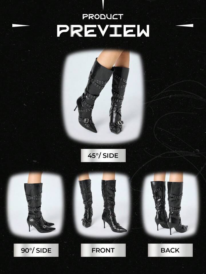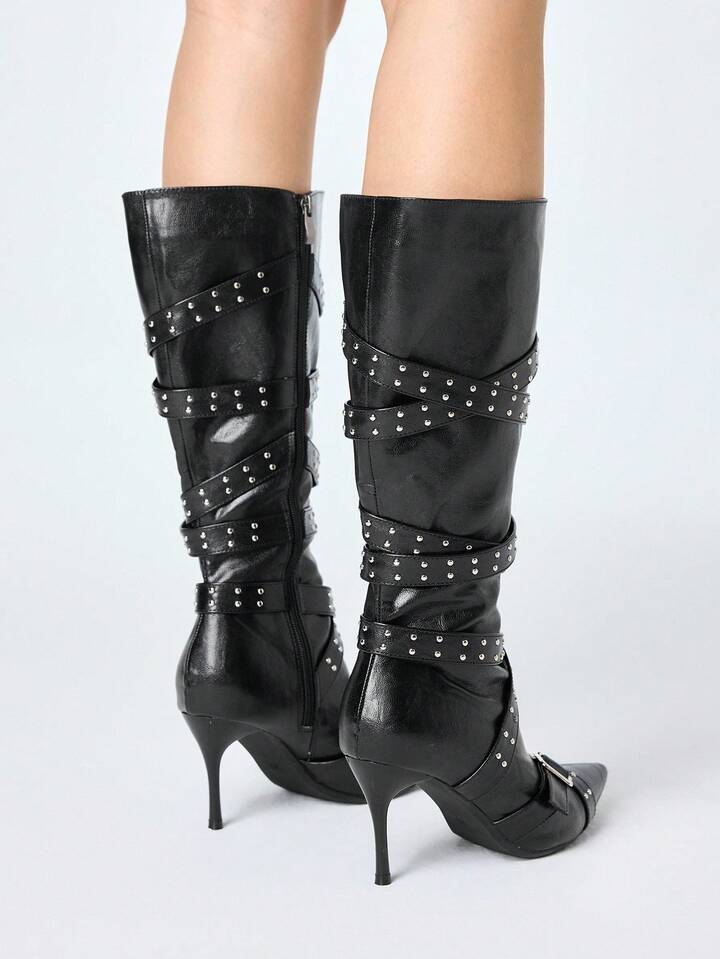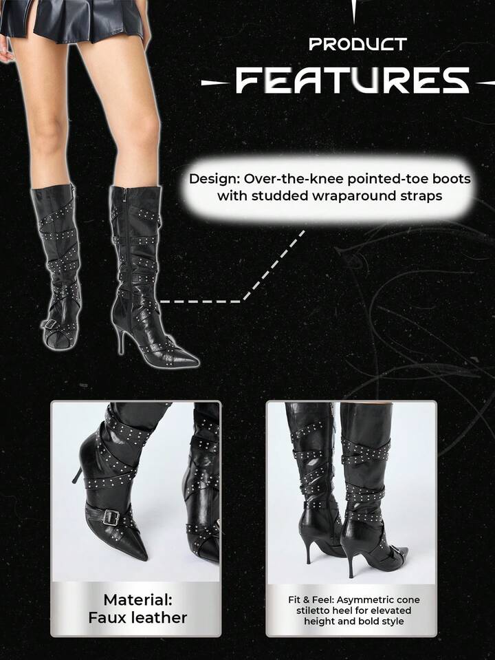 Grunge Punk Stivali da equitazione alti fino al ginocchio con punta affusolata, tacco a spillo e borchie, colore nero