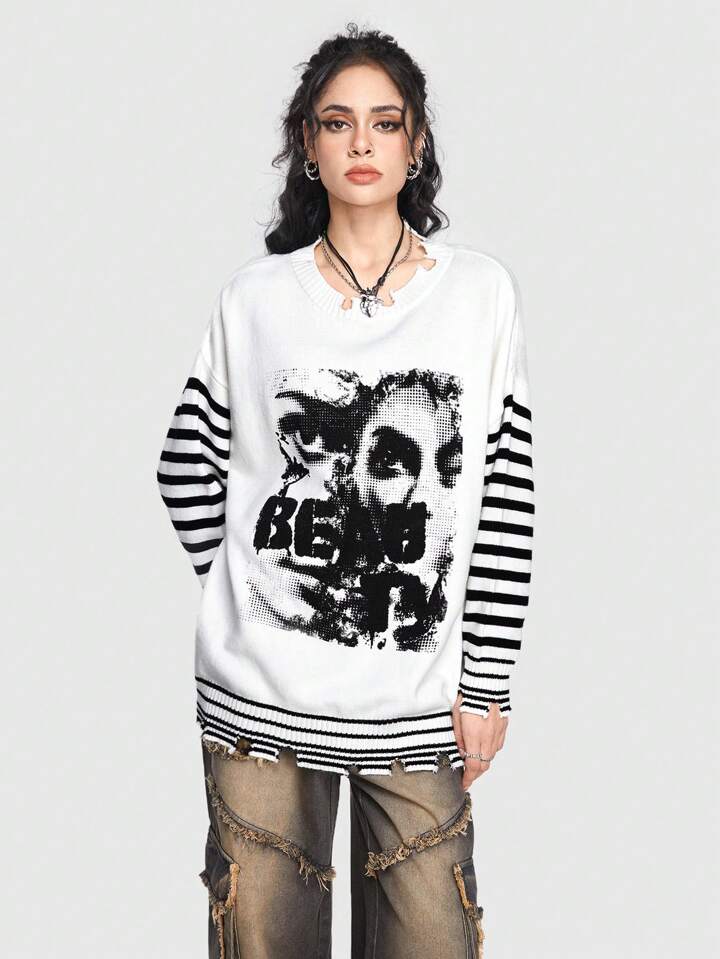 Grunge Punk Maglione Con Collo A Scialle Da Donna Con Silhouette Di Ritratto Stampato E Patchwork A Righe