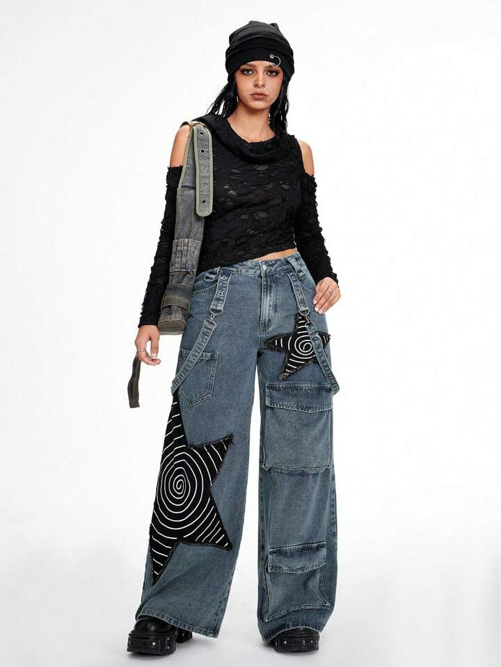 Grunge Punk Pantaloni cargo larghi da donna con gamba ampia, effetto consumato punk, con toppe a forma di stella