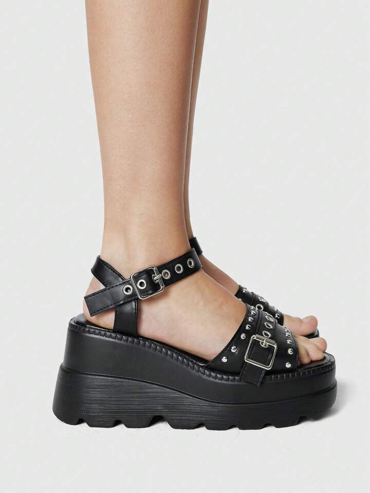 Grunge Punk Sandali da donna con cinturini, borchie e piattaforma, stile punk rock gotico, sandali open toe, zeppe estive da spiaggia in stile romano