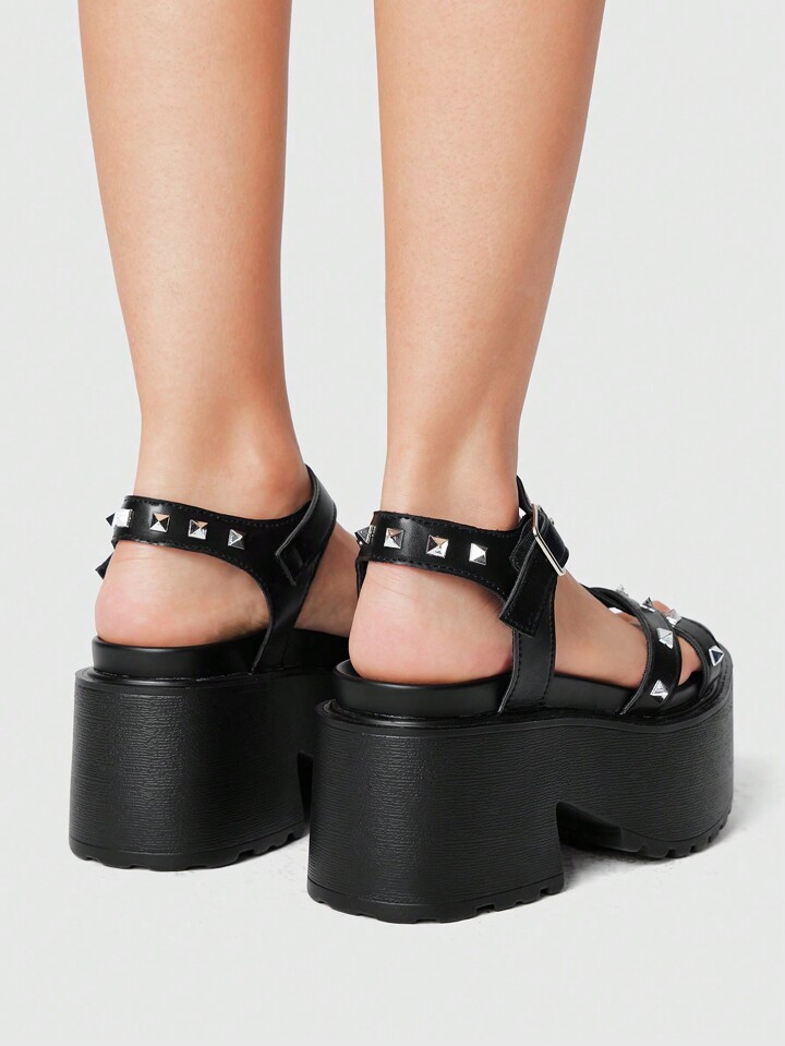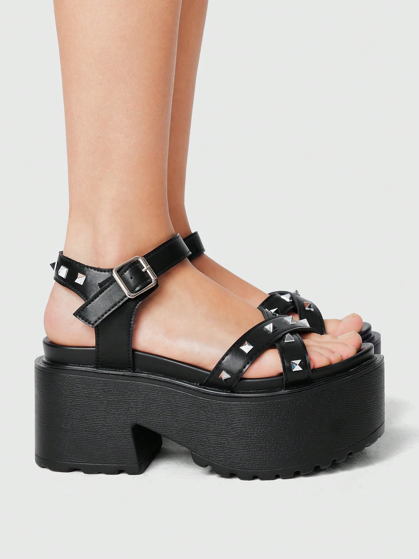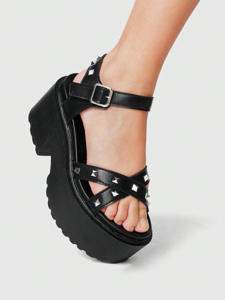 Grunge Punk Sandali neri gotici da donna in stile punk rock con cinturini incrociati e decorazioni a rivetto, sandali con zeppa romana da spiaggia, sandali con zeppa platform e tacco alto con punta aperta