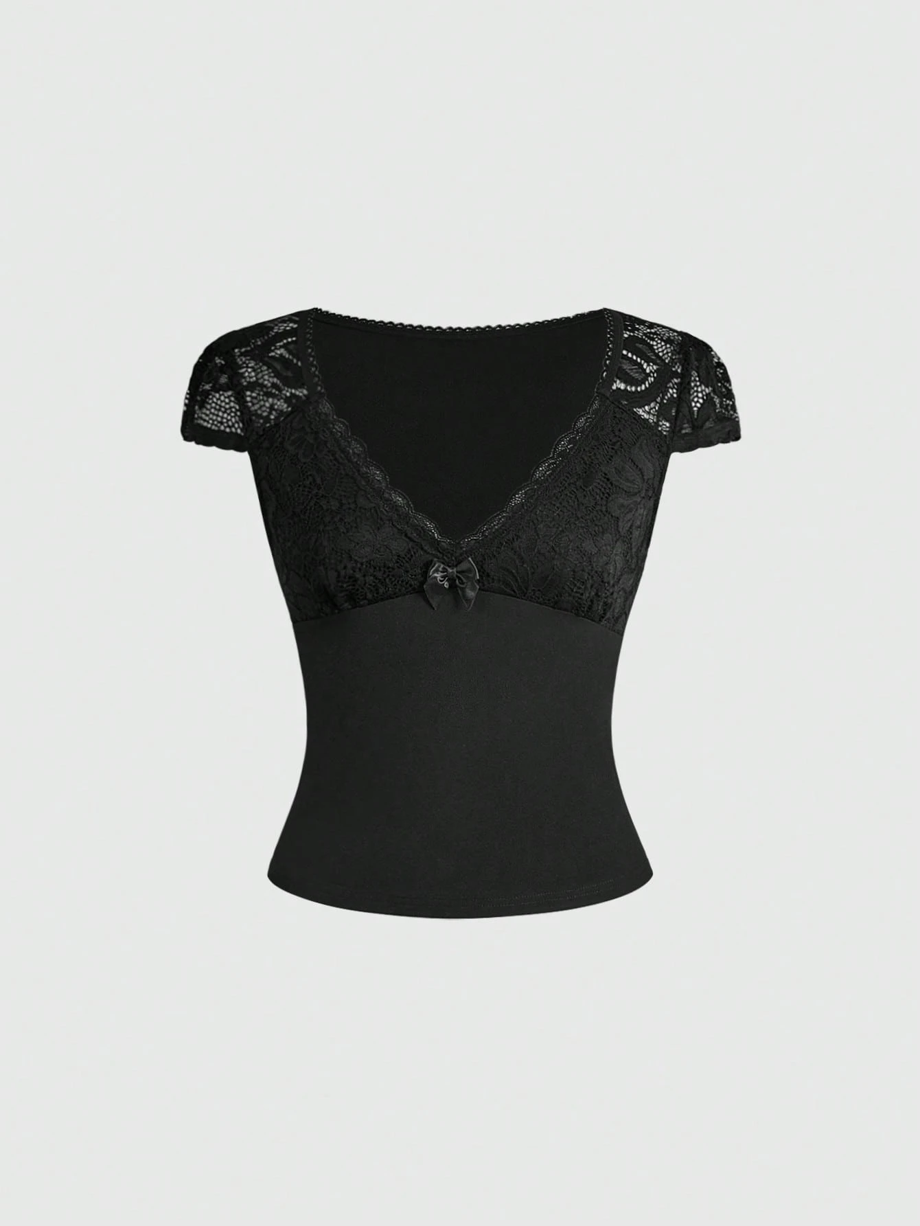 Grunge Punk Maglietta aderente da donna con scollo a V nero e pizzo a contrasto