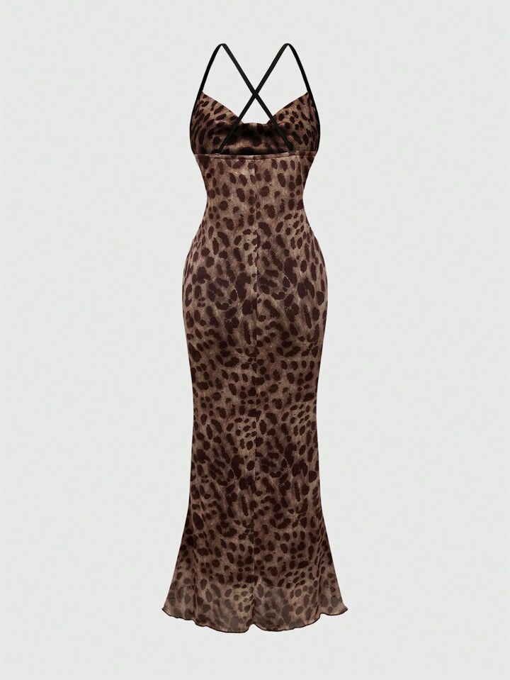 Abito da donna a sirena con schiena scoperta, collo drappeggiato e stampa leopardata, adatto per l'estate e il Capodanno