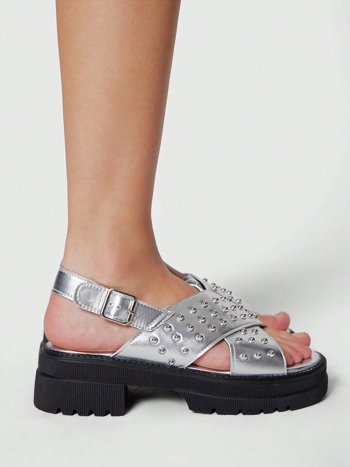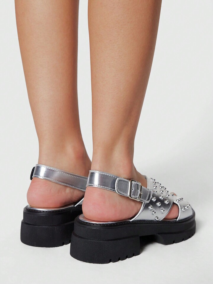 Grunge Punk Sandali da donna con fasce incrociate in argento, scarpe da spiaggia e vacanza estiva con zeppa platform punk e borchie