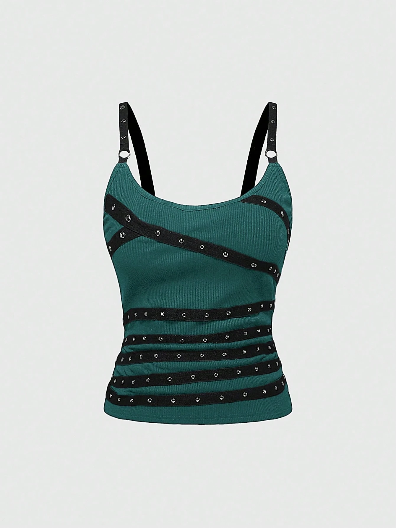 Grunge Punk Canotta da donna sexy senza maniche con spalline sottili, scollo profondo, nera, con borchie, cristalli e nastri, adatta per spiaggia estiva, laurea, Pasqua, concerti, vacanze a Nashville, festival musicali, rock