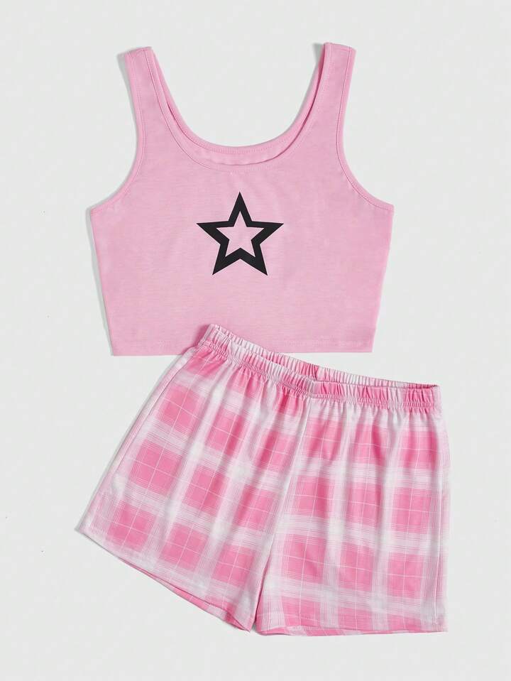 Grunge Punk Set Pigiama Da Donna Con Top A Spalline Con Stampa Stelle E Digitale E Shorts A Quadri