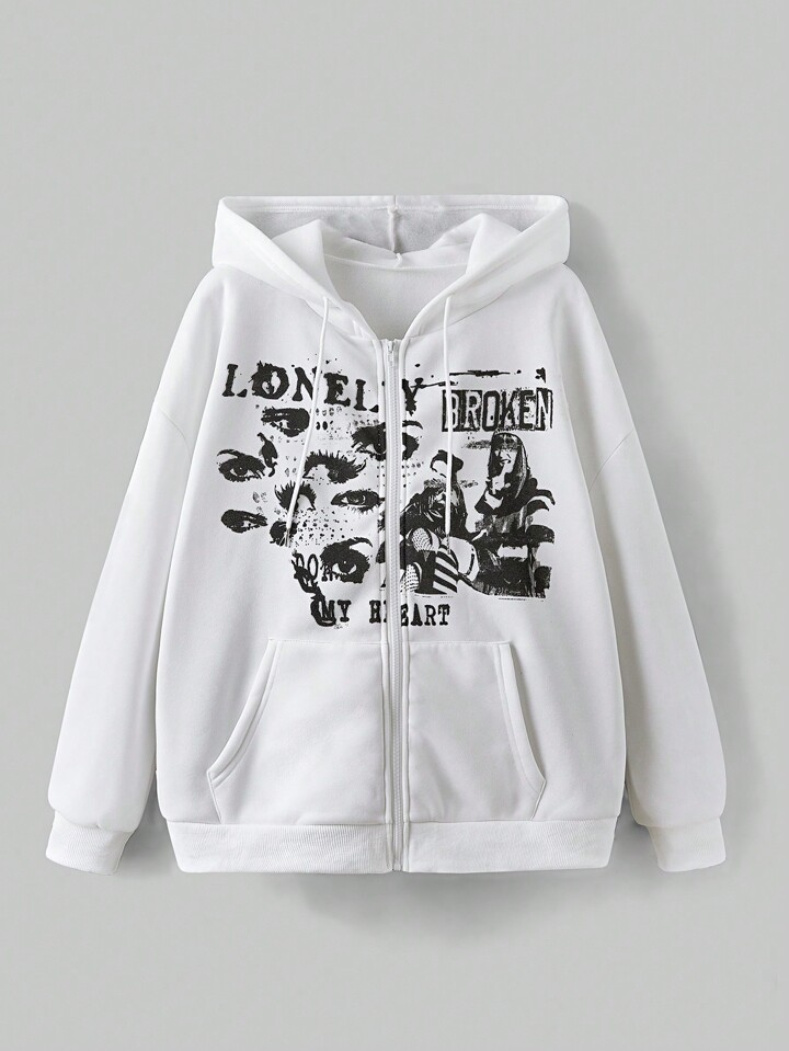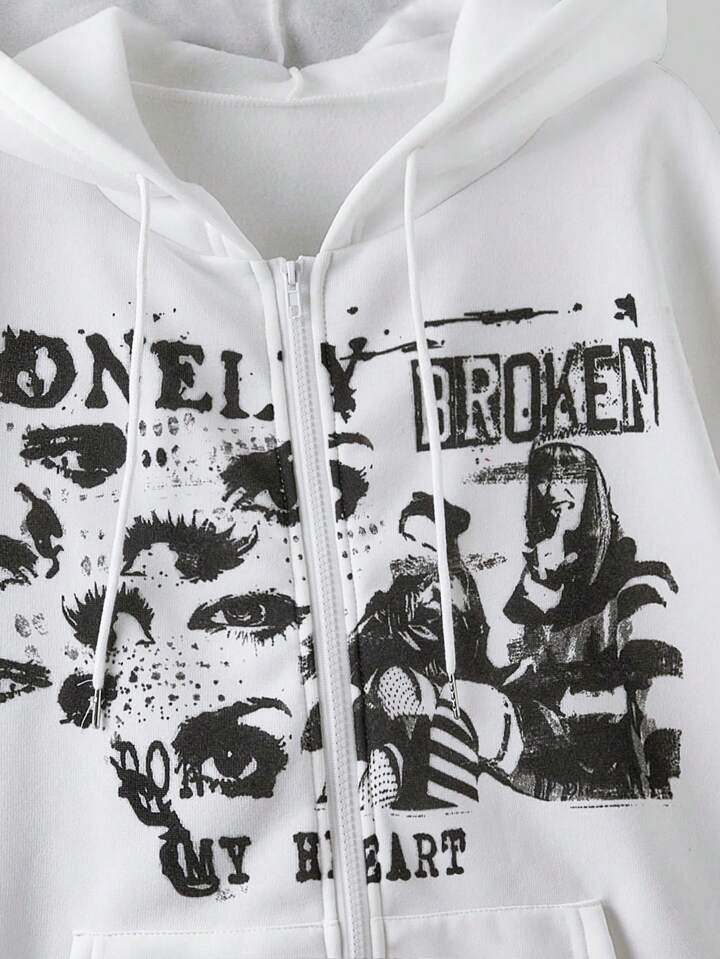 Grunge Punk Felpa con cappuccio da donna streetwear punk con stampa ritratto bianco retrò, foderata termicamente