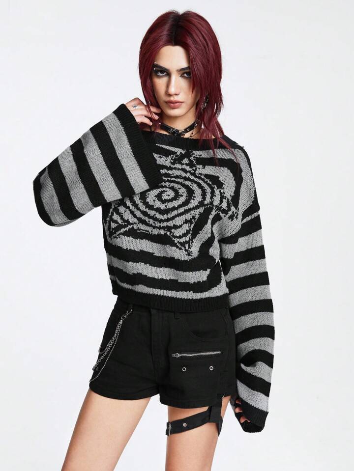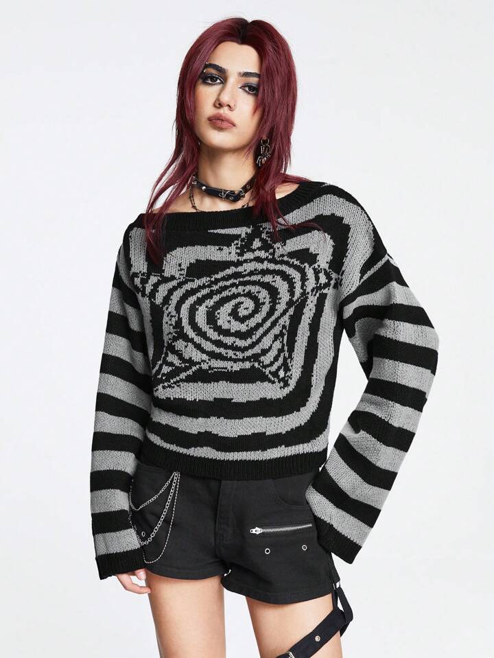 Grunge Punk Maglione a spalle scoperte rigato da donna, per la scuola