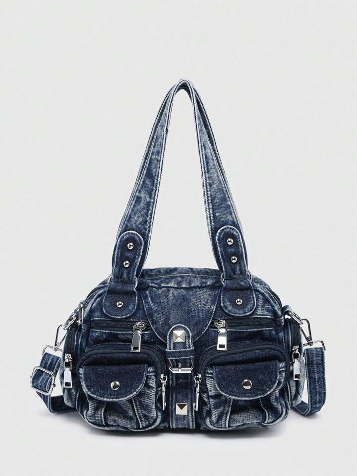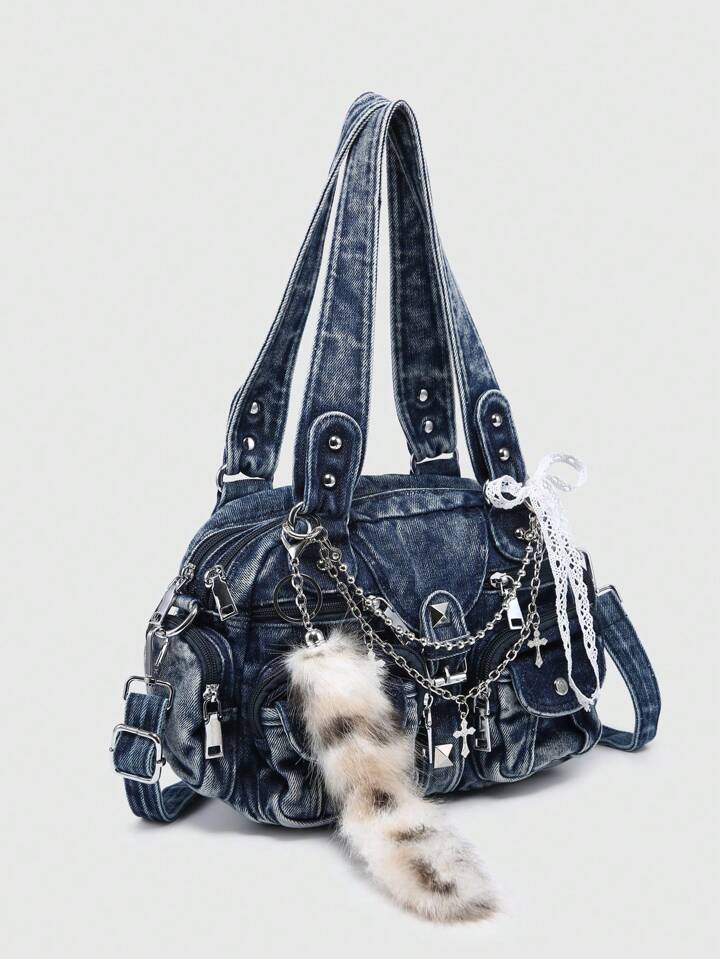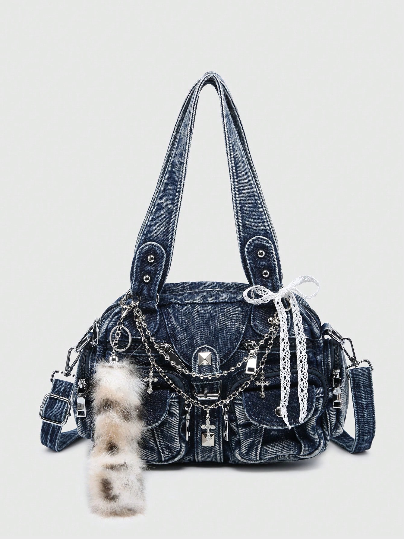 Grunge Punk Borsa a spalla vintage da donna con decorazione a croce e cuore sfumata e fiocco, grande capacità, multitasche