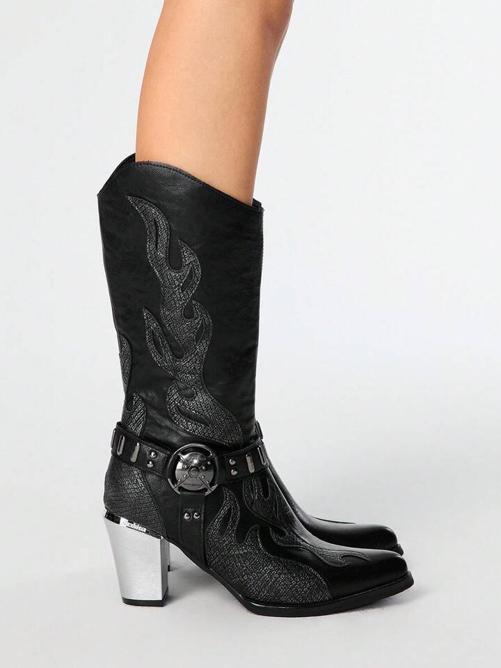 Grunge Punk Stivali donna di metà polpaccio con punta affusolata e ricamo in stile western