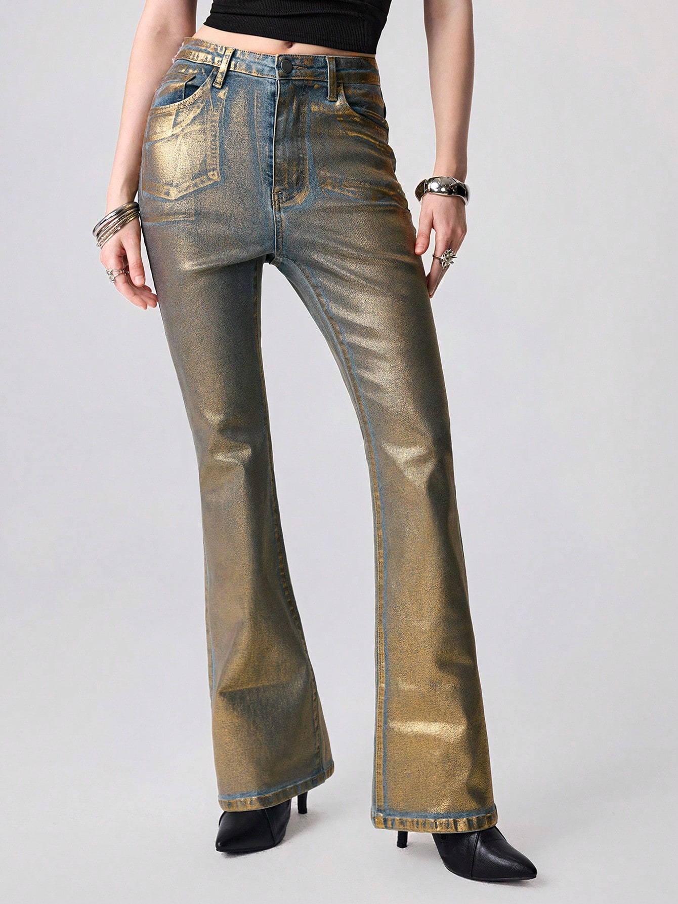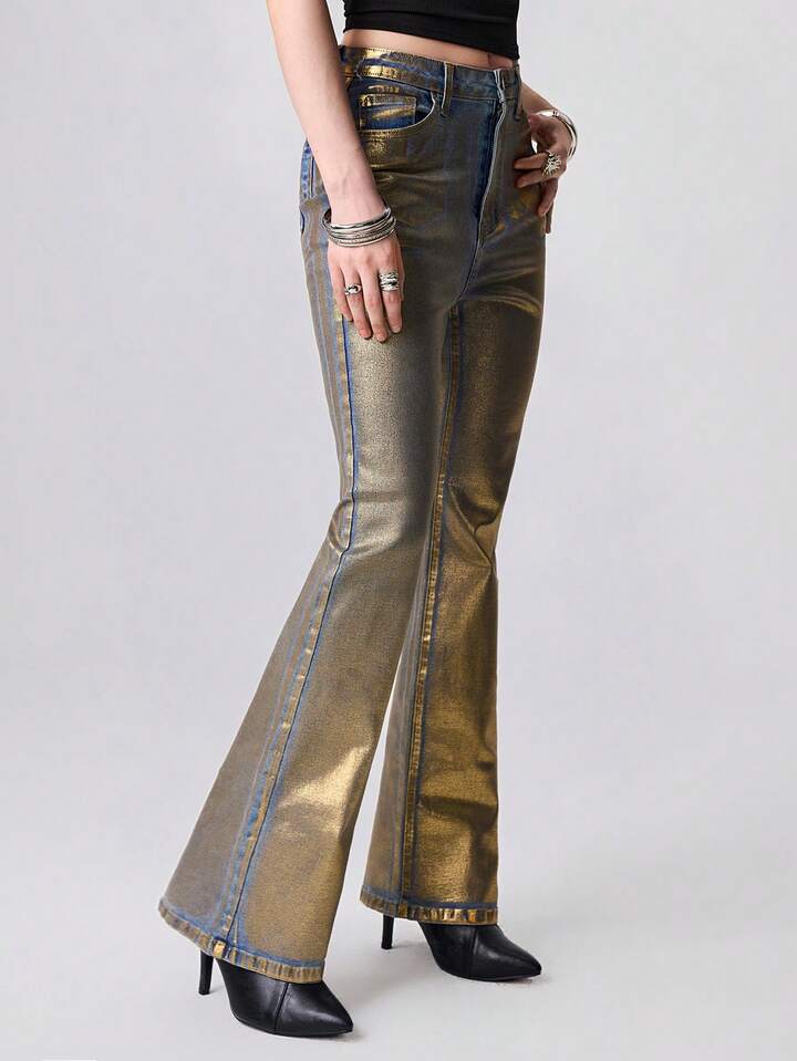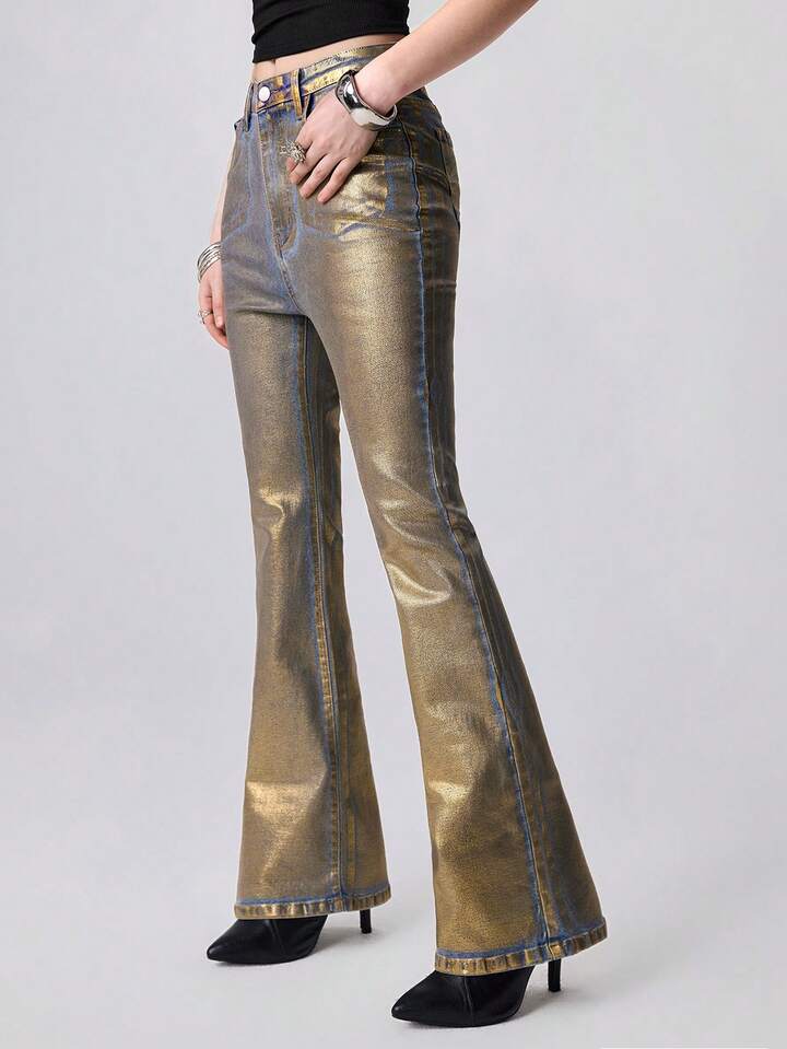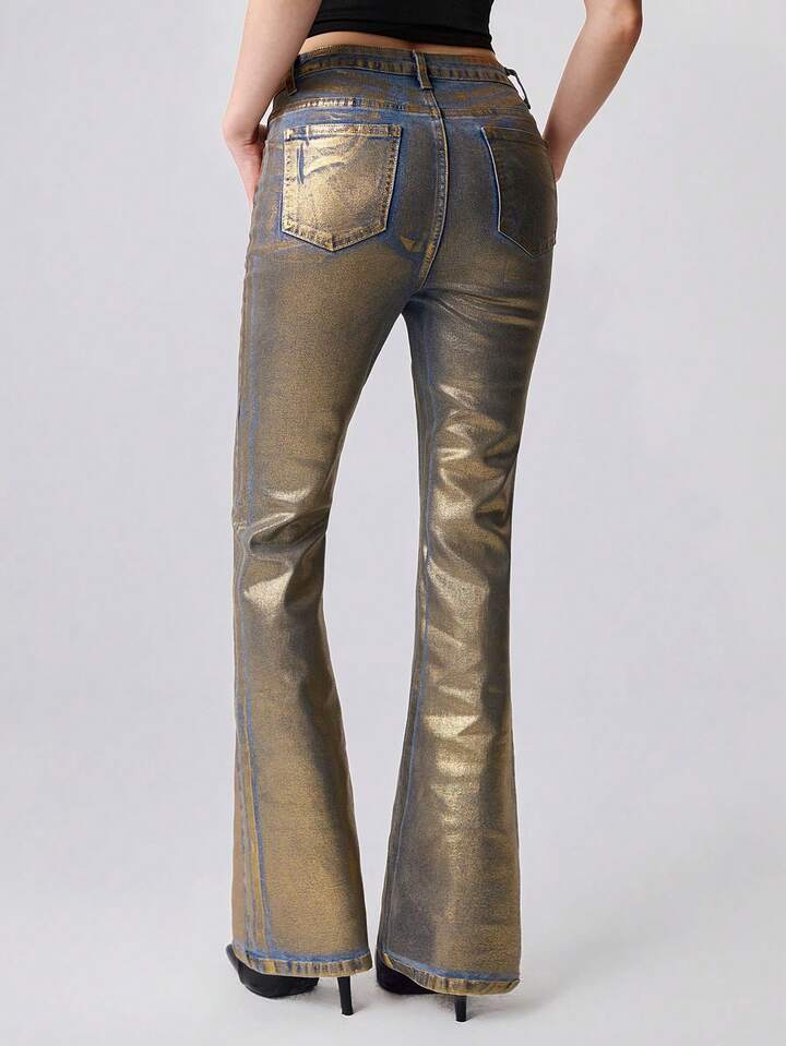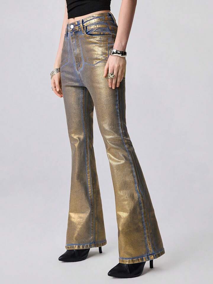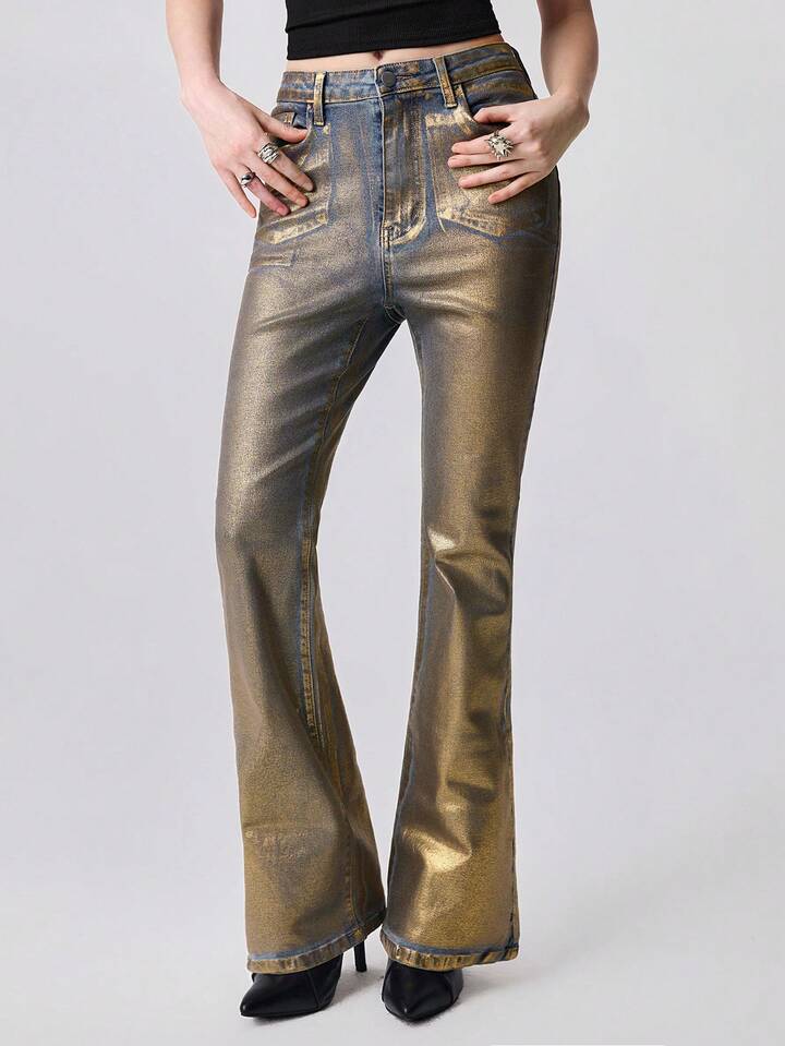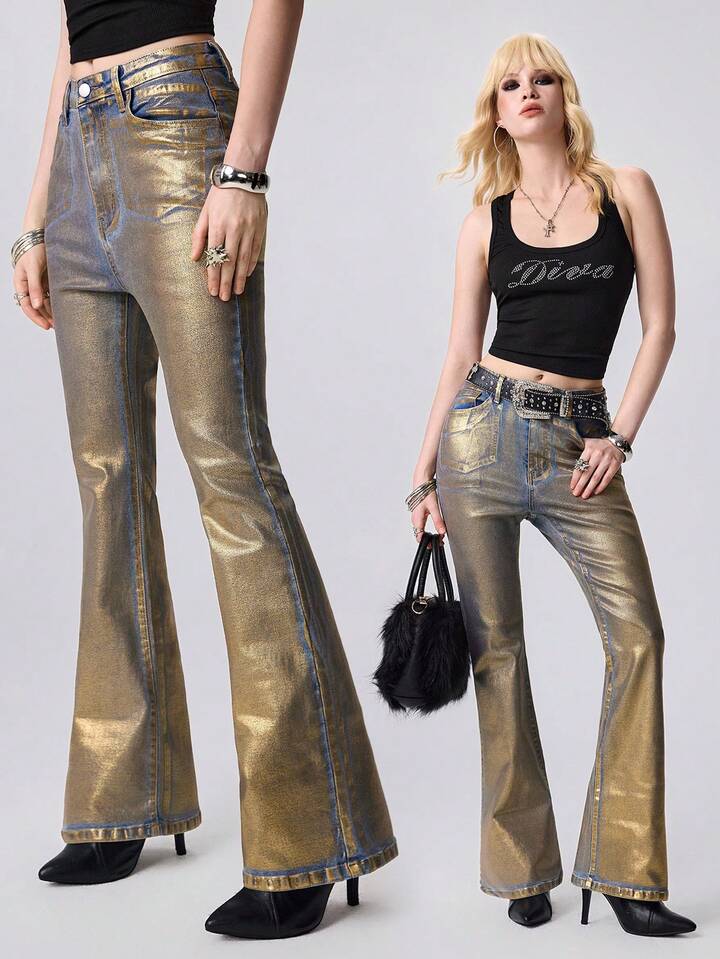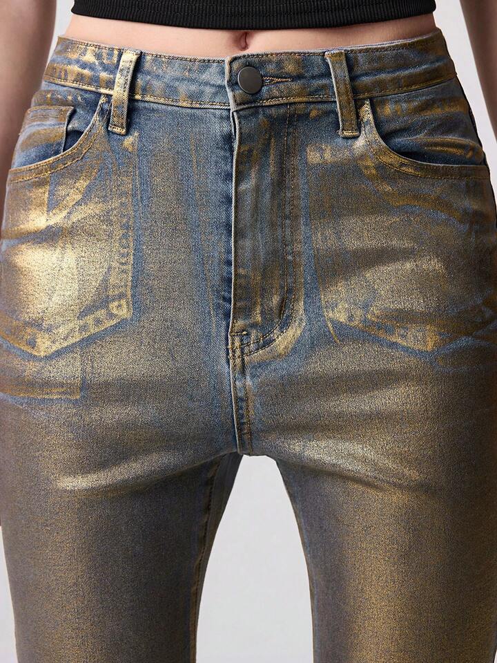 Grunge Punk Jeans skinny a vita bassa con stampa in lamina d'oro, stile Y2K