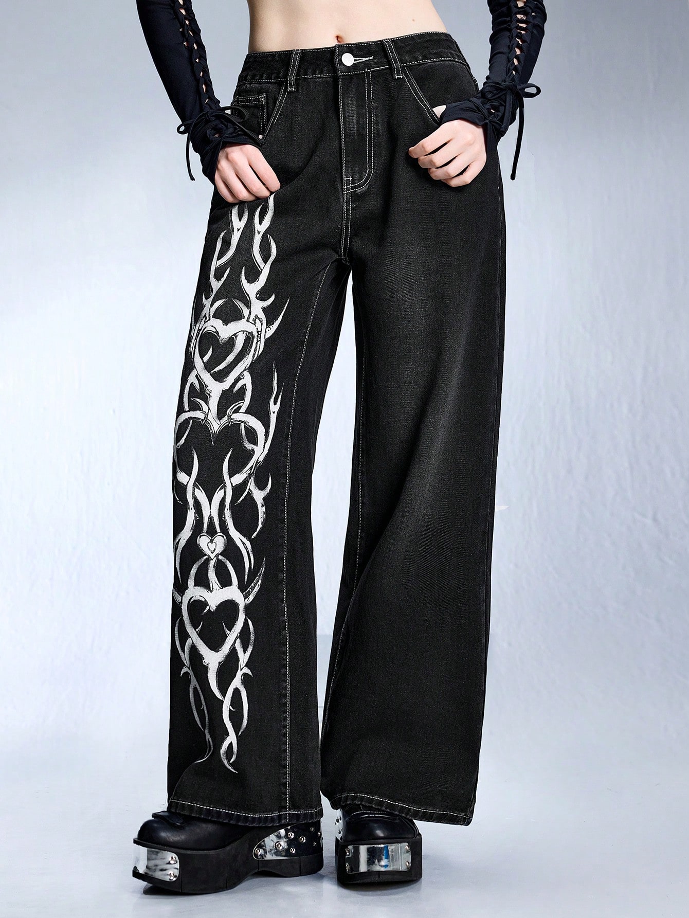 Grunge Punk Jeans da donna con stampa a cuore con spine in metallo stile Y3K