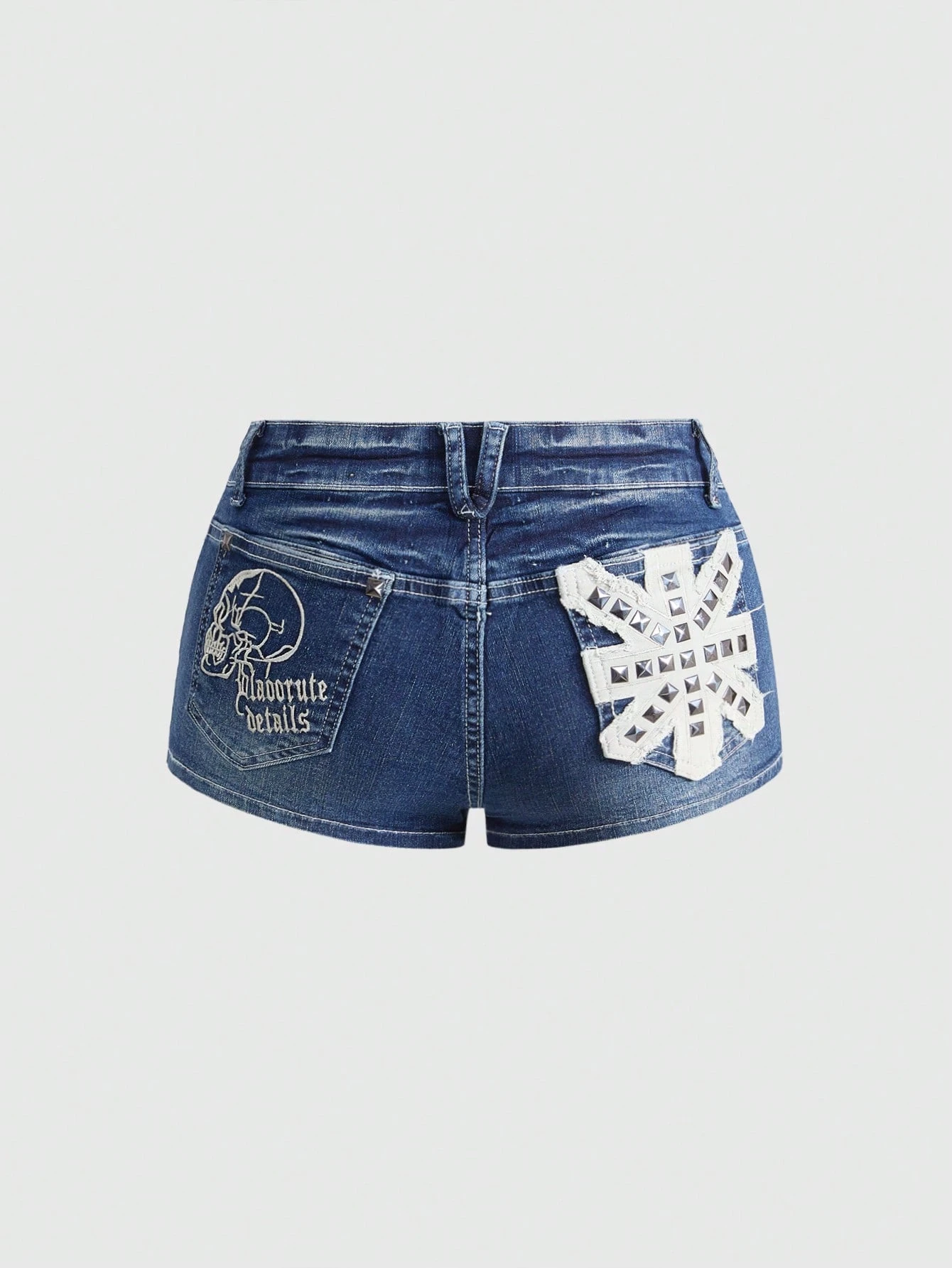 Grunge Punk Shorts di jeans da donna con vita super bassa, decorati con ricamo a teschio e borchie, in stile Y2K