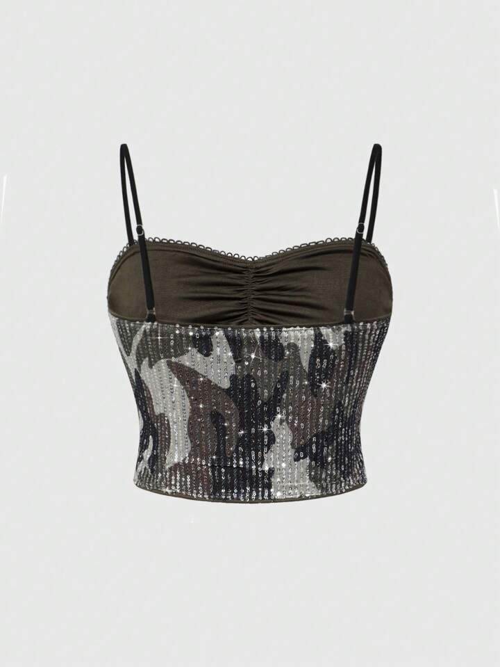 Grunge Punk Canotta da donna Y2K Baddie estiva con scollo a V, in tessuto mimetico e pizzo con paillettes, versatile