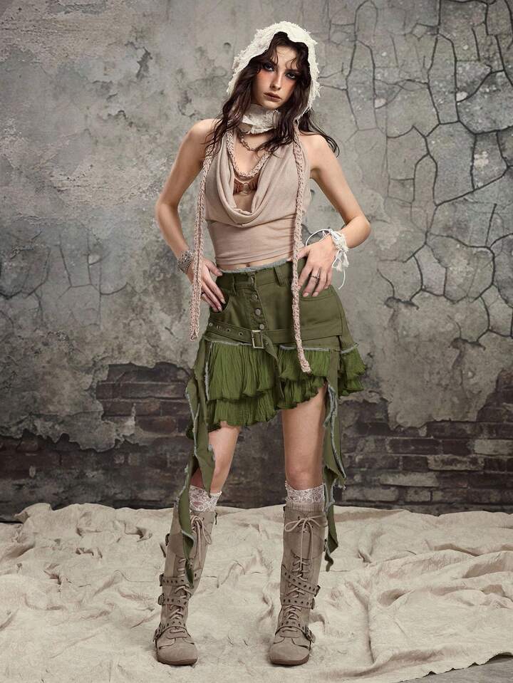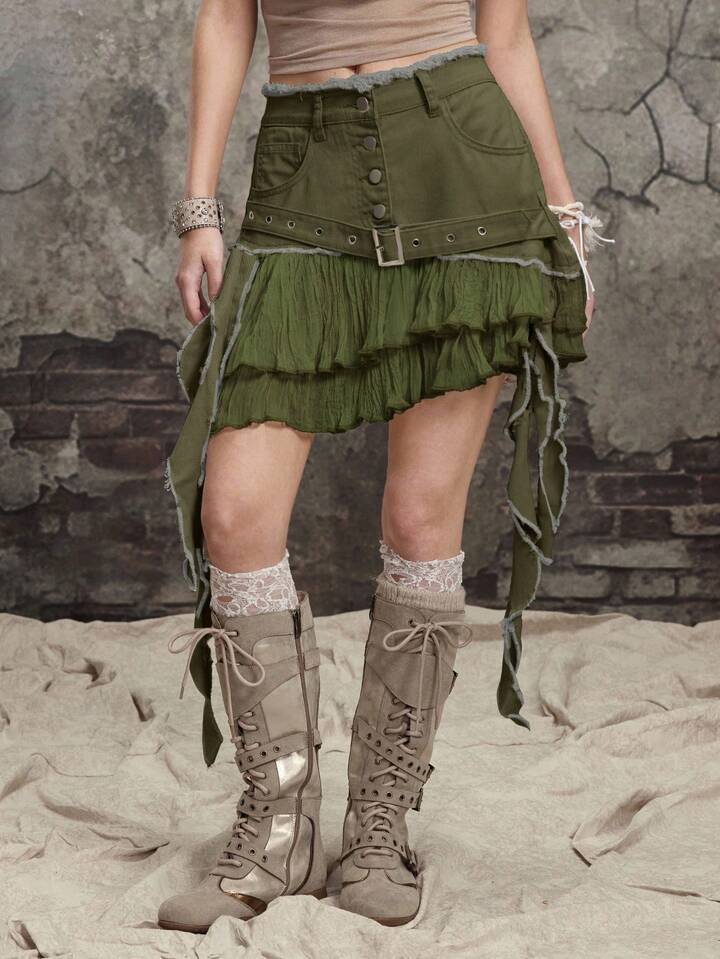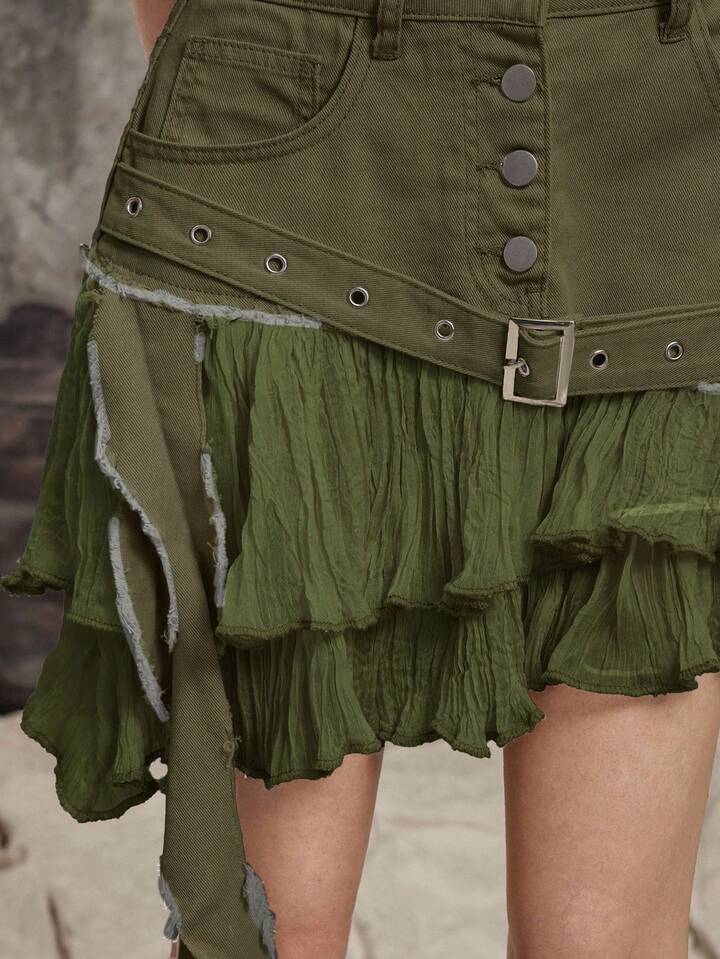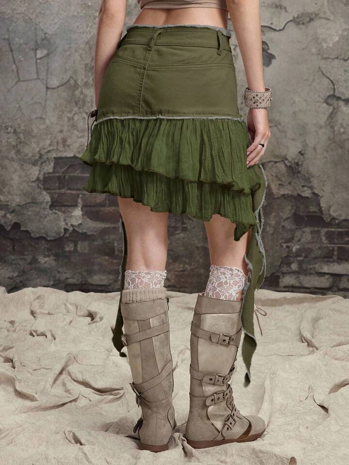 Grunge Punk Gonna di jeans mini da donna con design patchwork, orlo arricciato e effetto vissuto, in stile Y2K