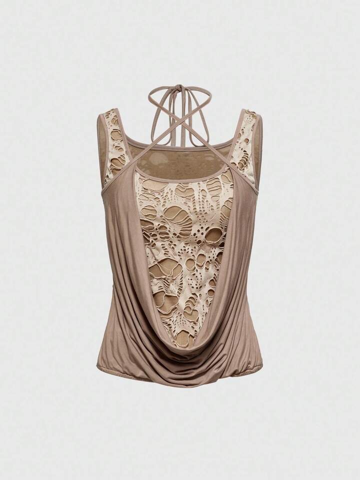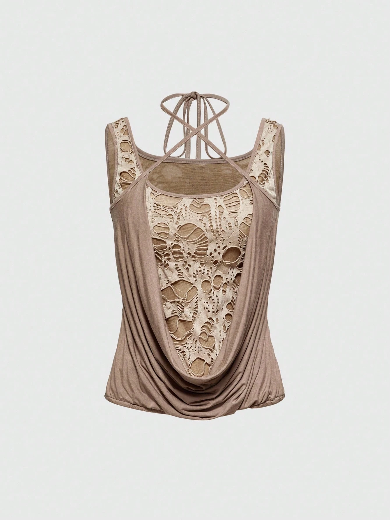 Grunge Punk Canotta corta aderente, patchwork in tessuto consumato, scollo drappeggiato, stile punk dystopian Y2K, 2 in 1