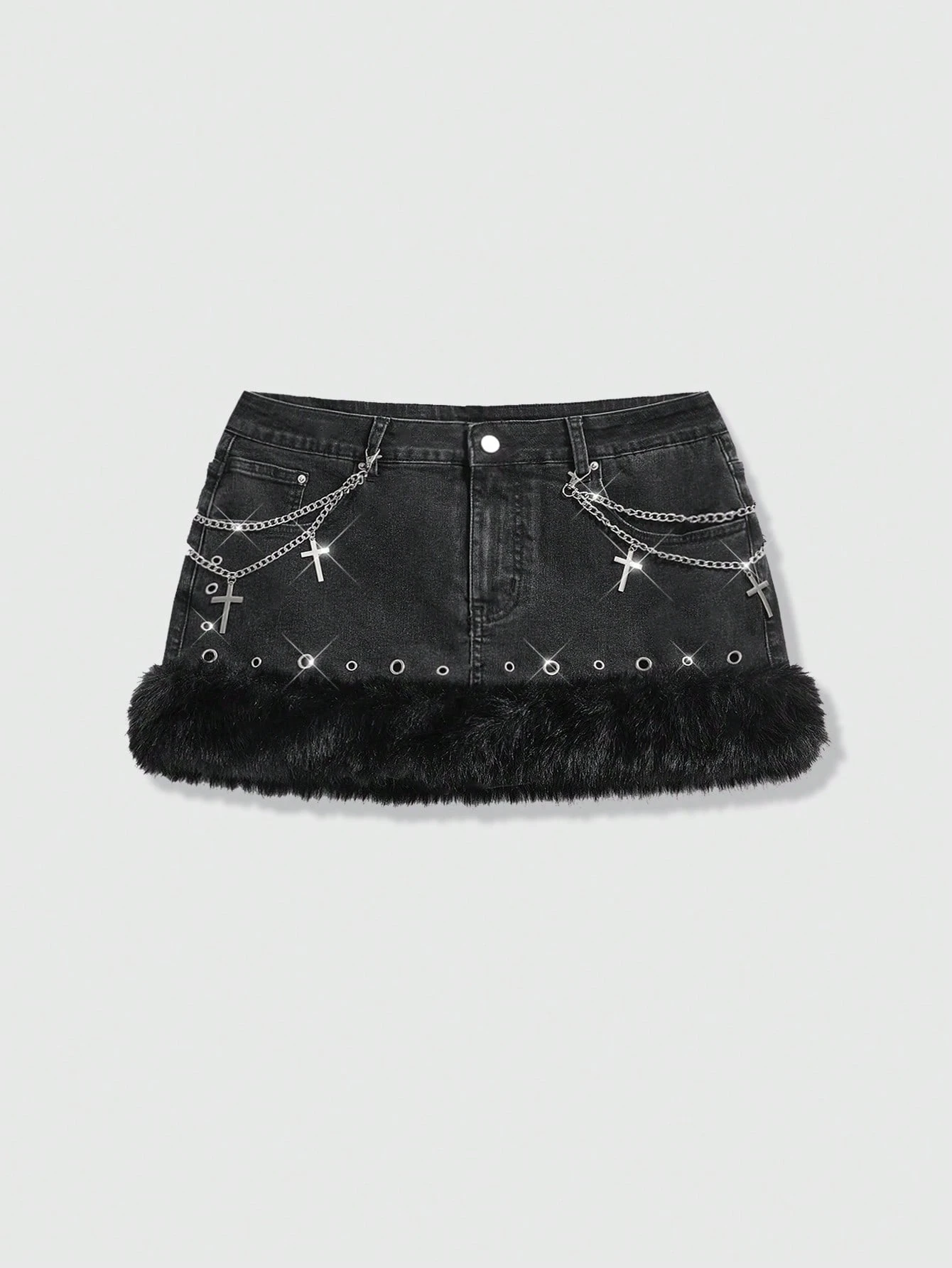 Grunge Punk Minigonna di jeans con catena a croce e occhielli, stile streetwear Y2K, taglie forti. Gonna a-line in jeans soffice e chic da strada, stile autunnale/invernale, in jeans nero