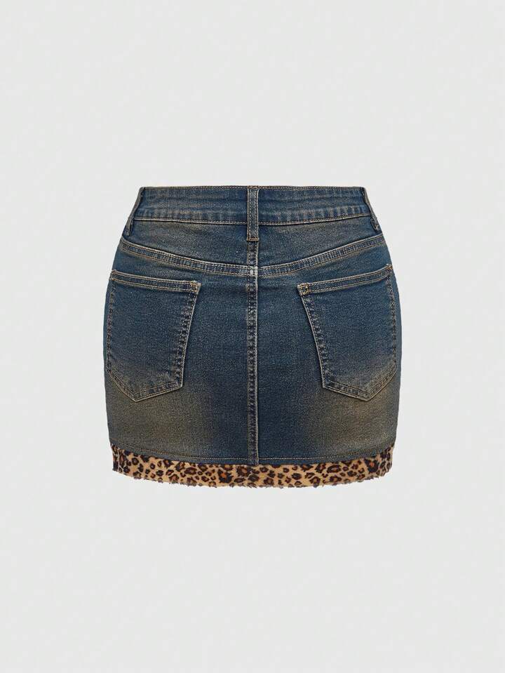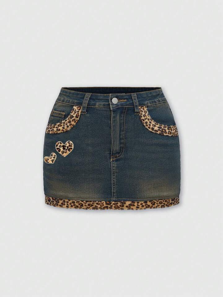 Grunge Punk Minigonna di jeans con patchwork in stile "Baddie" retro Gyaru Y2K, con stampa leopardata, cuore e pelliccia, adatta per San Valentino