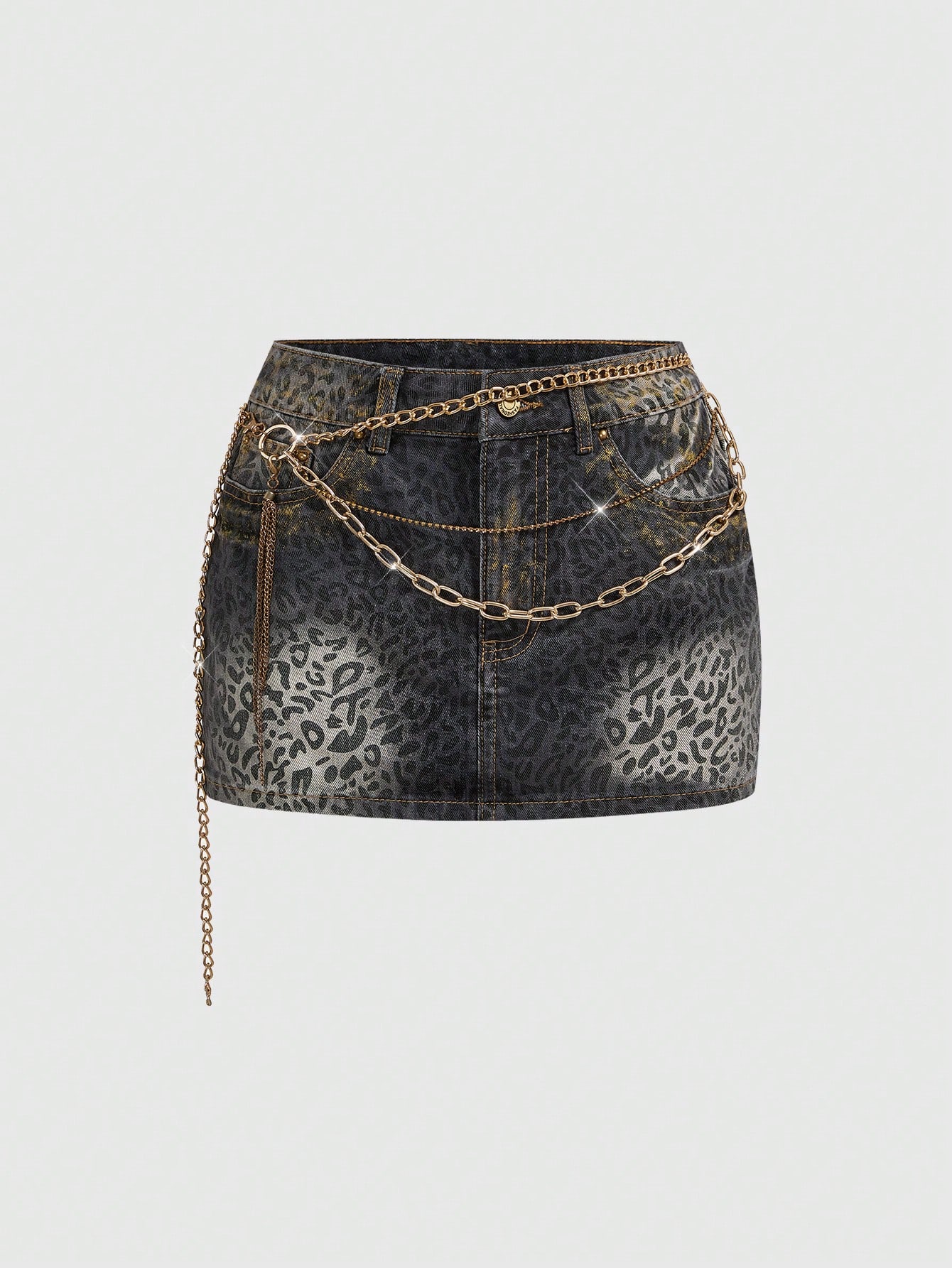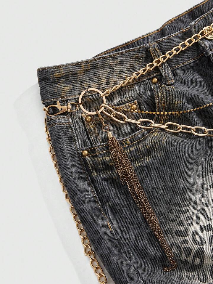 Grunge Punk Minigonna in denim con stampa leopardata, catena di strass metallici e vita super bassa, stile Y2K