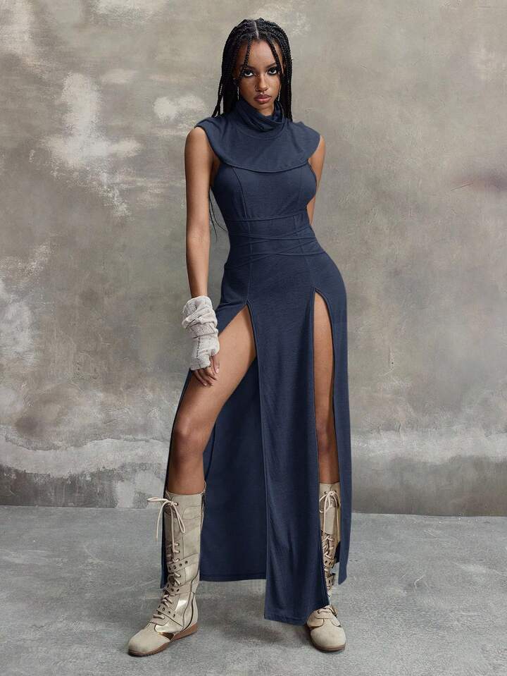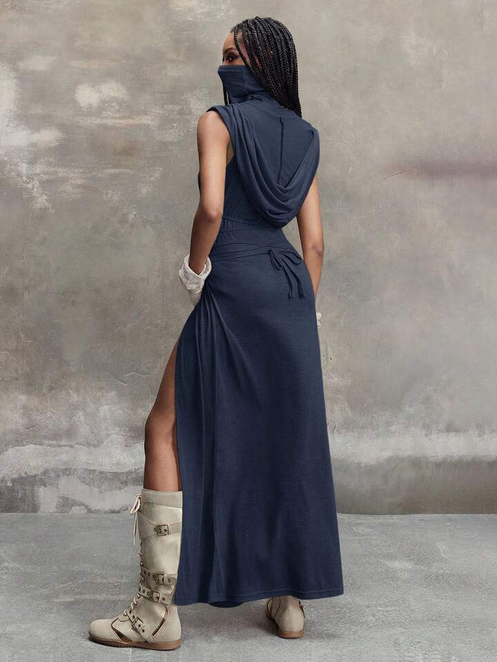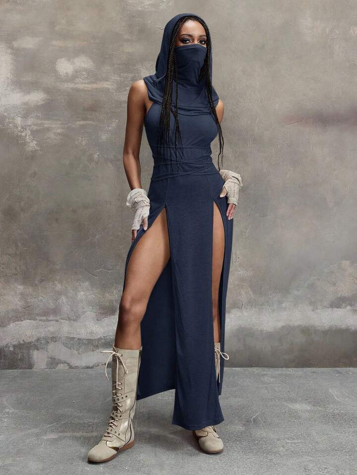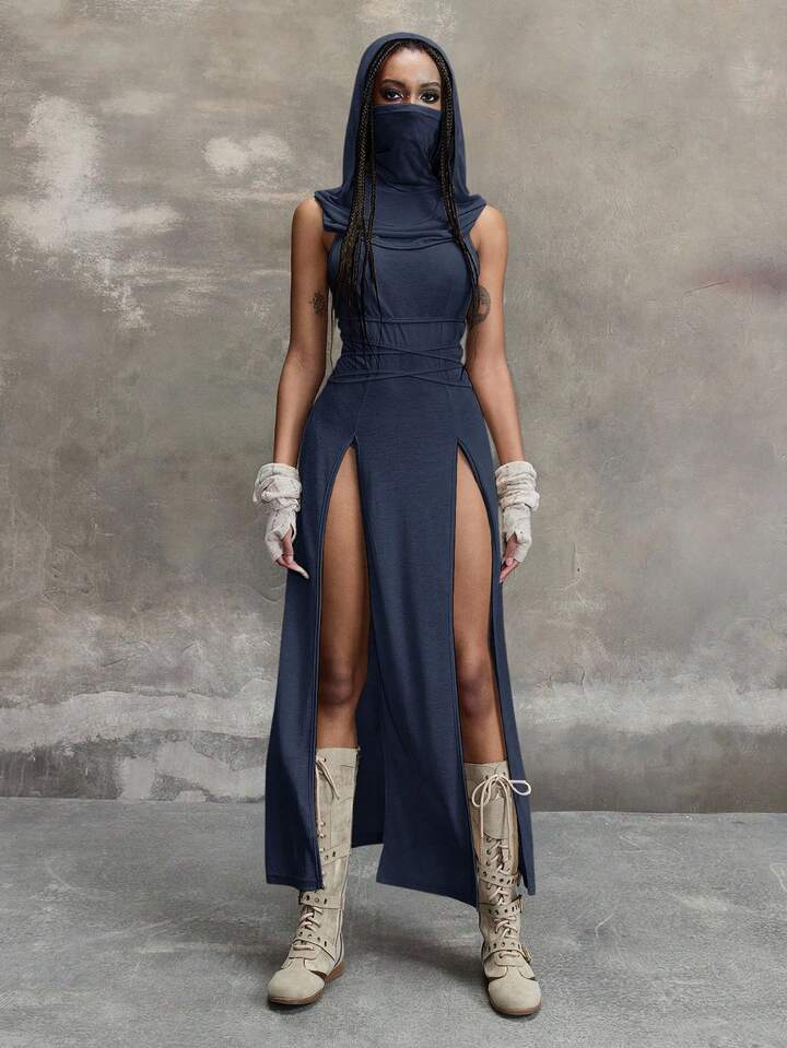 Grunge Punk Abito con cappuccio, scollo a V profondo e spacco alto, in stile retrò Y2K apocalittico
