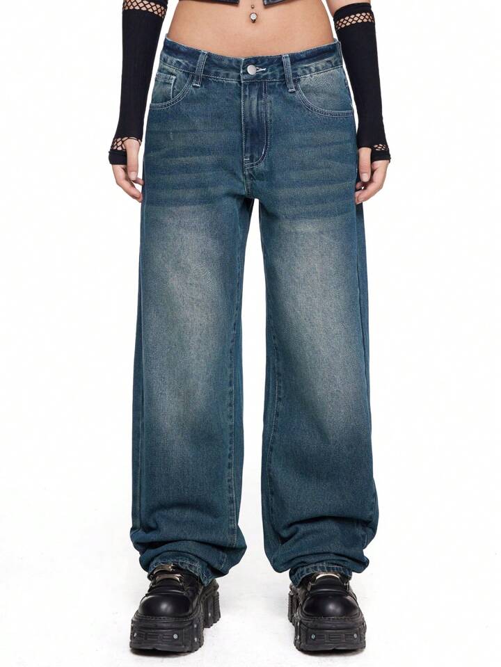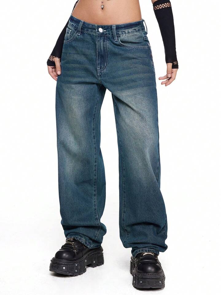 Grunge Punk Jeans con vita bassa e ampi, in stile punk Y2K, con ricami di ali, catena e croce sul retro