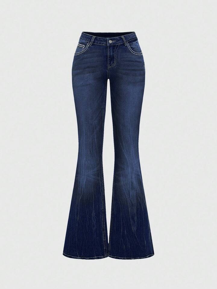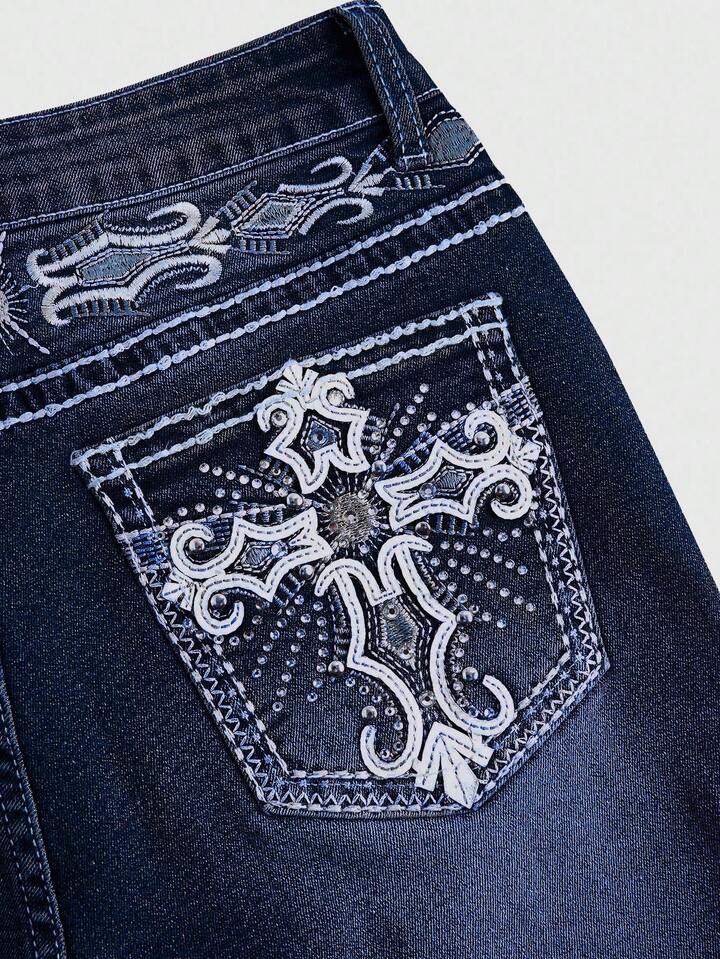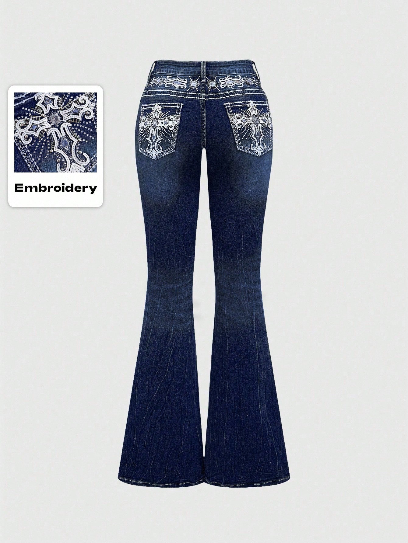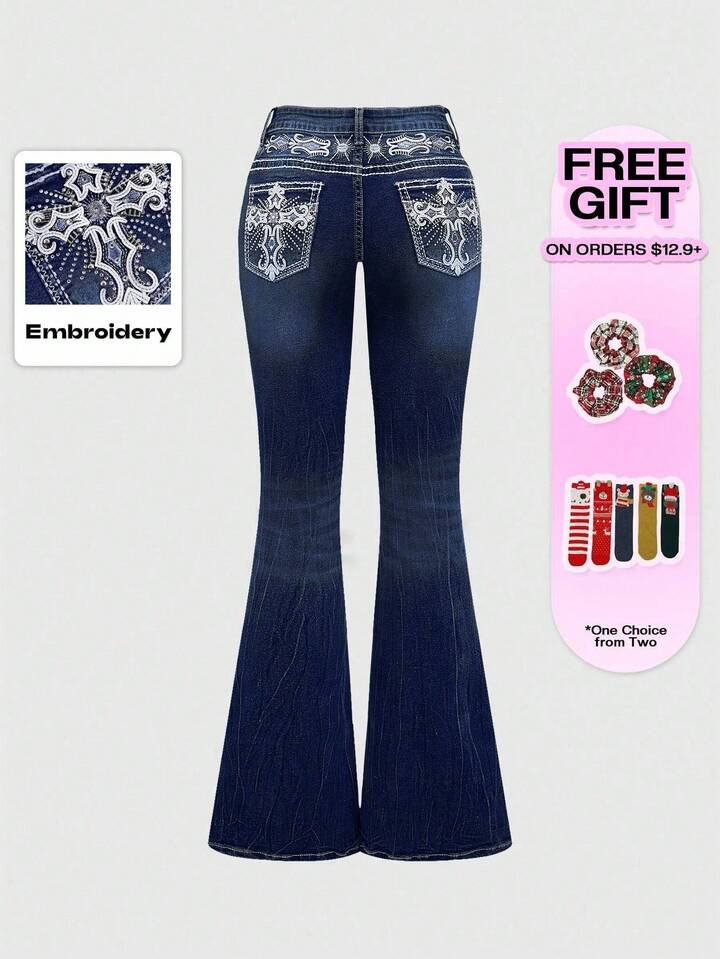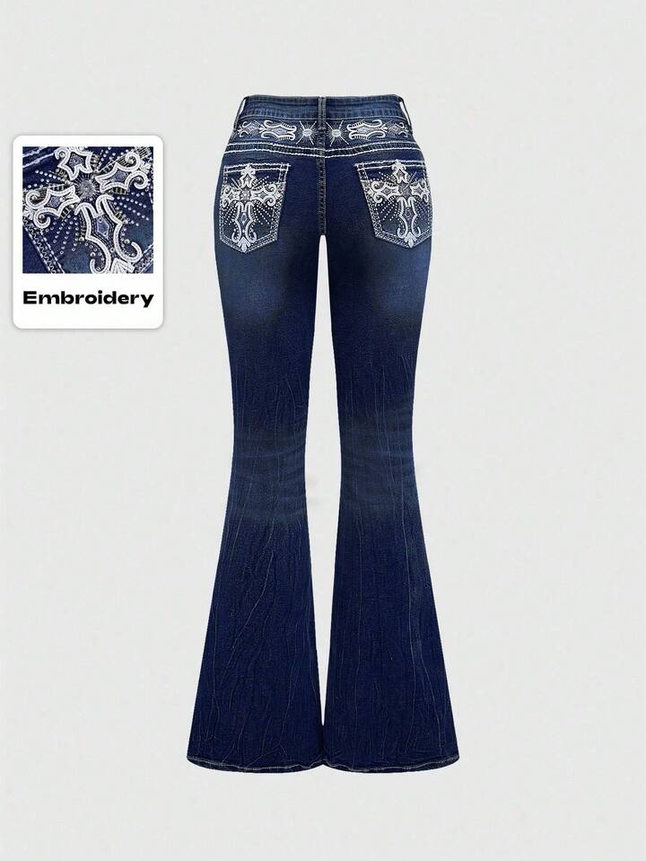 Grunge Punk Jeans da donna a zampa con vita corta, tasche, ricamo a croce e ali, in stile retrò Y2K