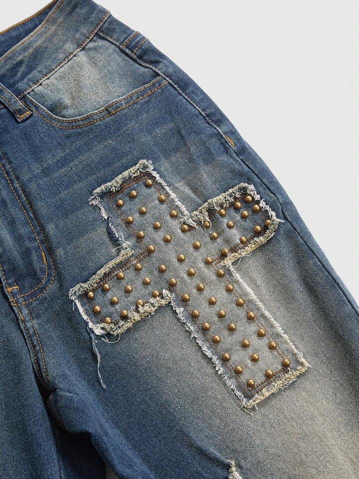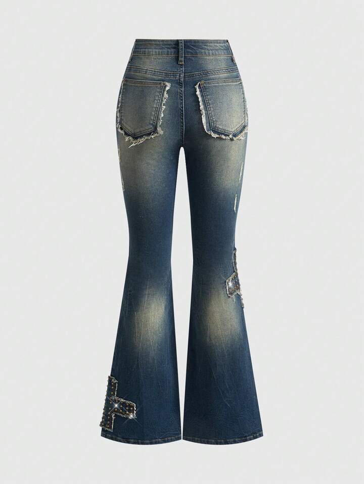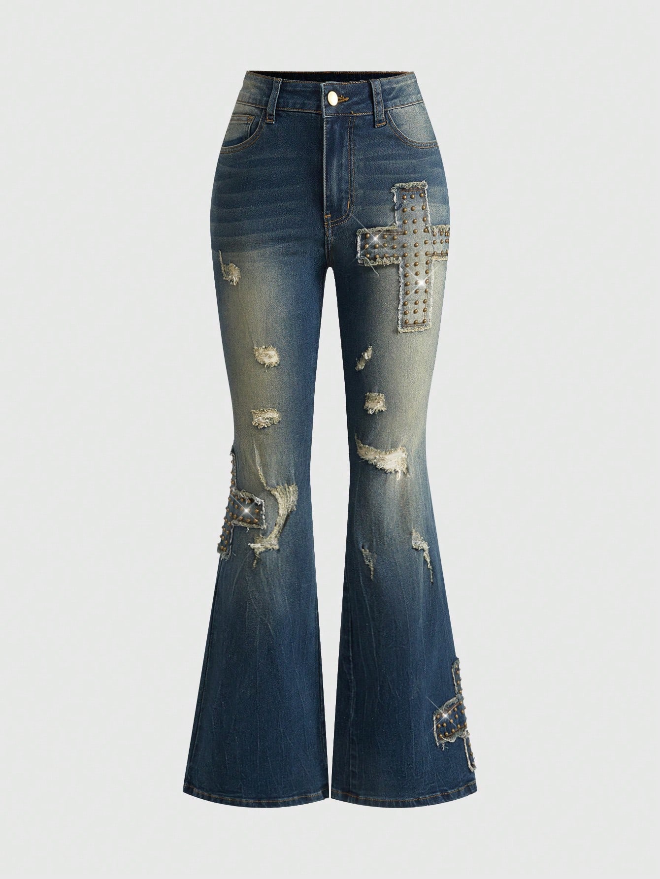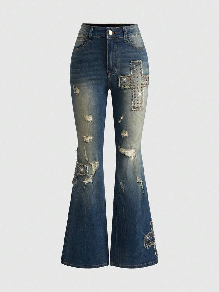 Grunge Punk Jeans a zampa di elefante slim fit da donna con design retrò Y2K, millennium baddie, con borchie a croce e effetto consumato