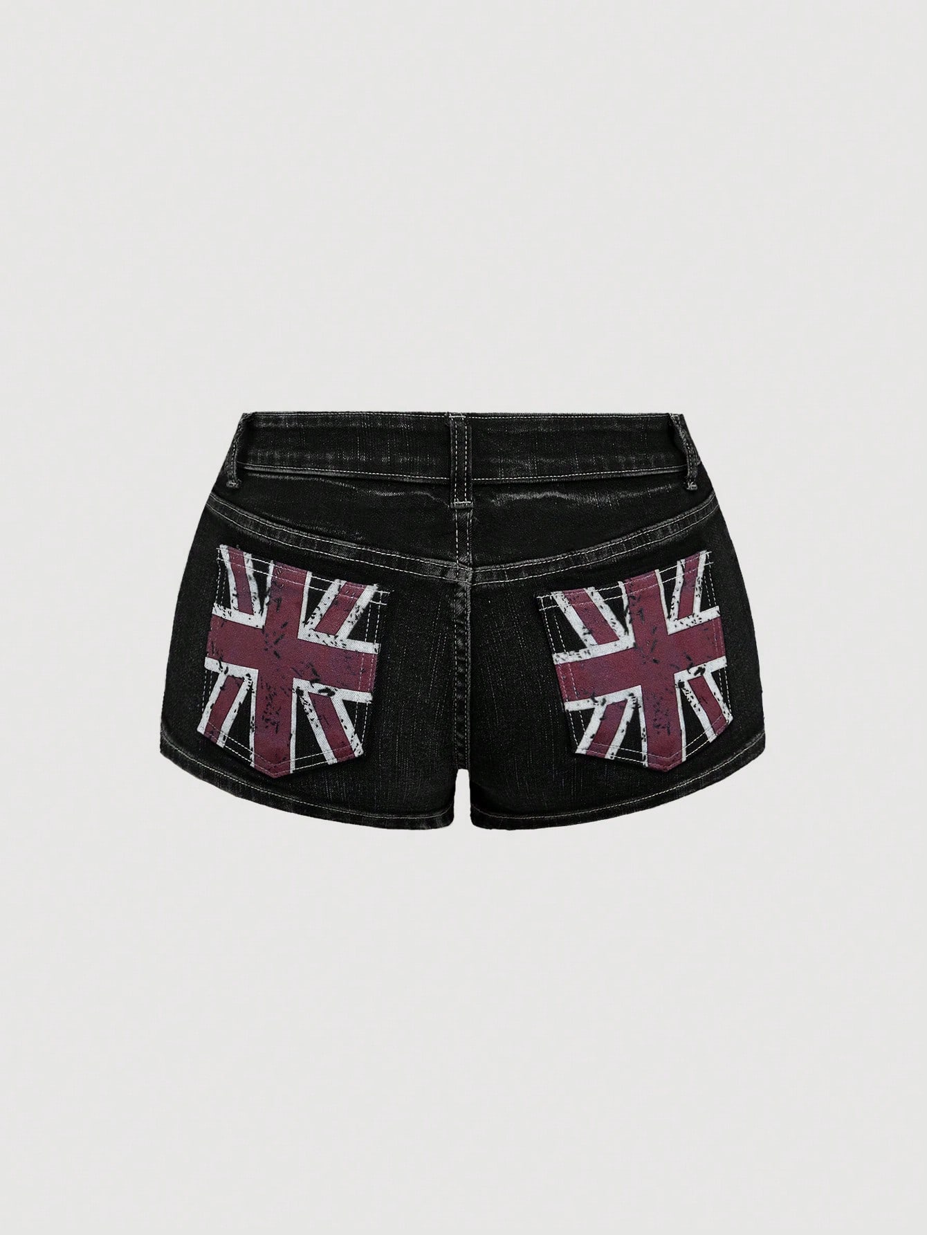 Grunge Punk Pantaloncini di jeans a vita super bassa con lavaggio retrò, tasche e stampa della bandiera del Regno Unito, in stile Y2K