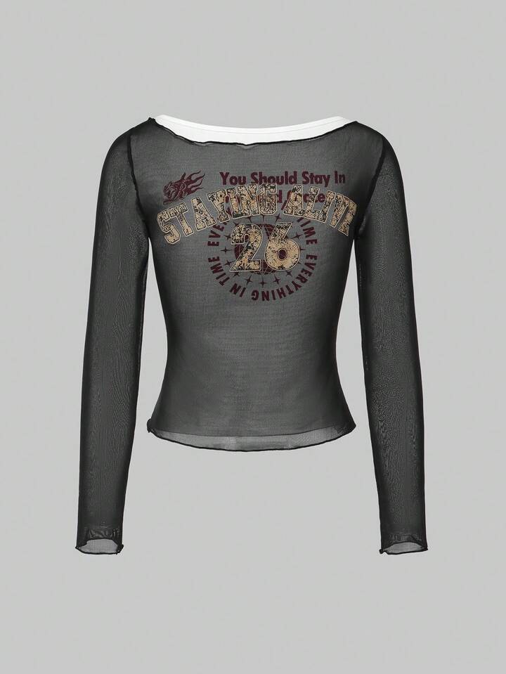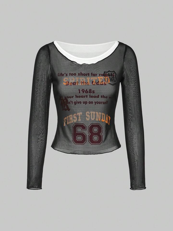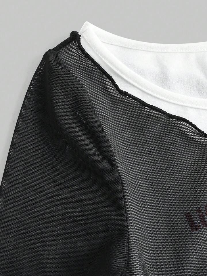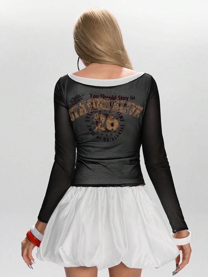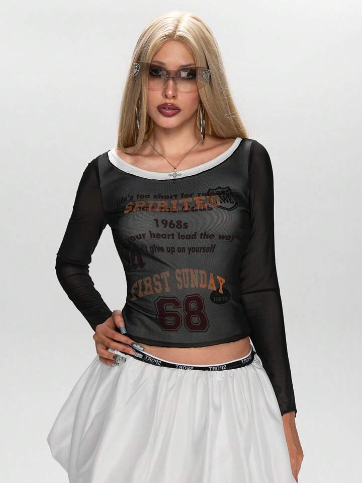 Grunge Punk Parte superiore donna Y2K sexy e trasparente in rete stampata, senza spalle