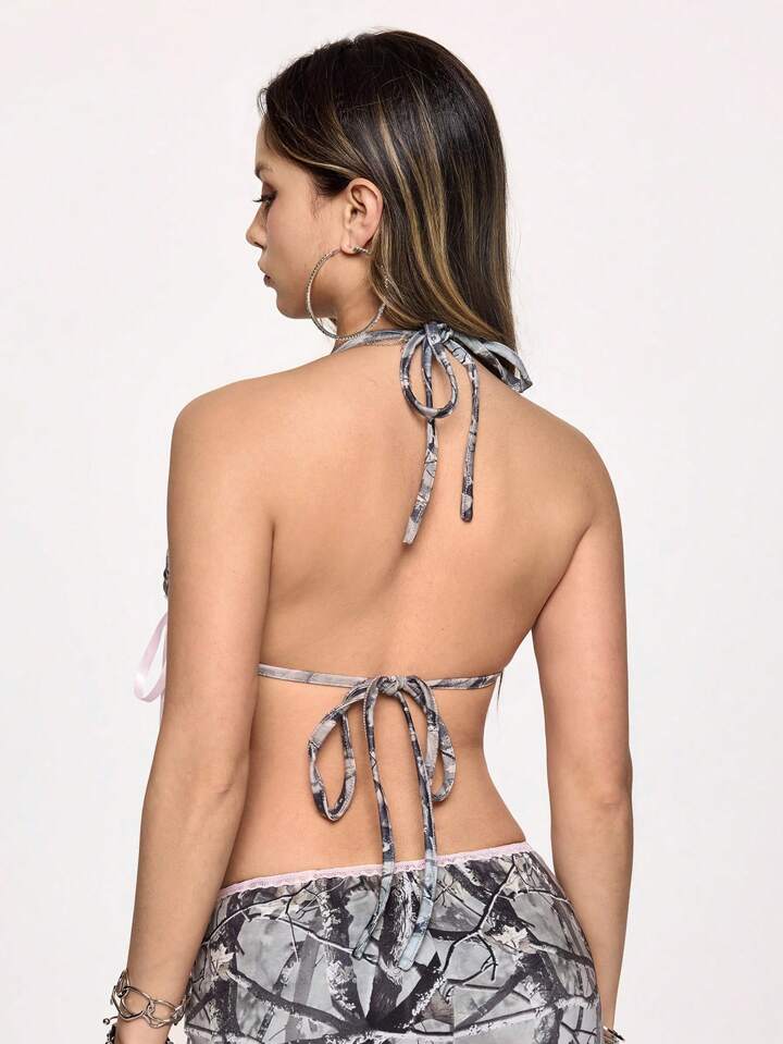 Grunge Punk Bikini effetto sottogonna in stile Y2K, sexy, di colore fucsia acceso, con lacci, stampa mimetica a contrasto di colore e foglie su tutto il capo