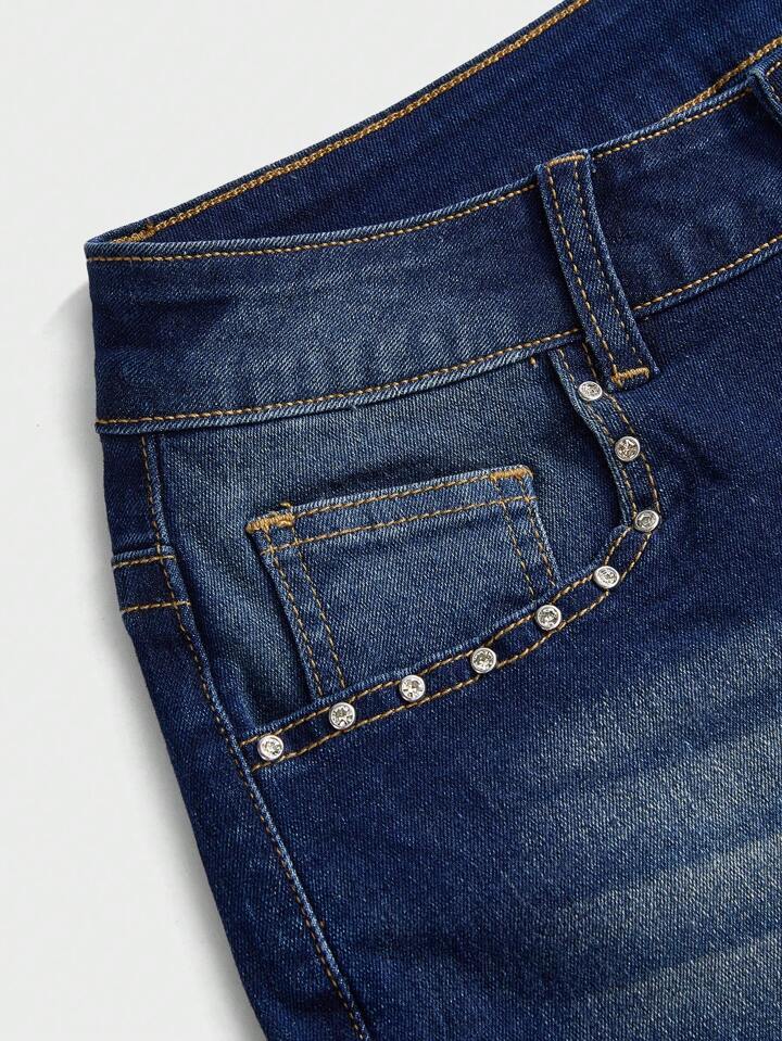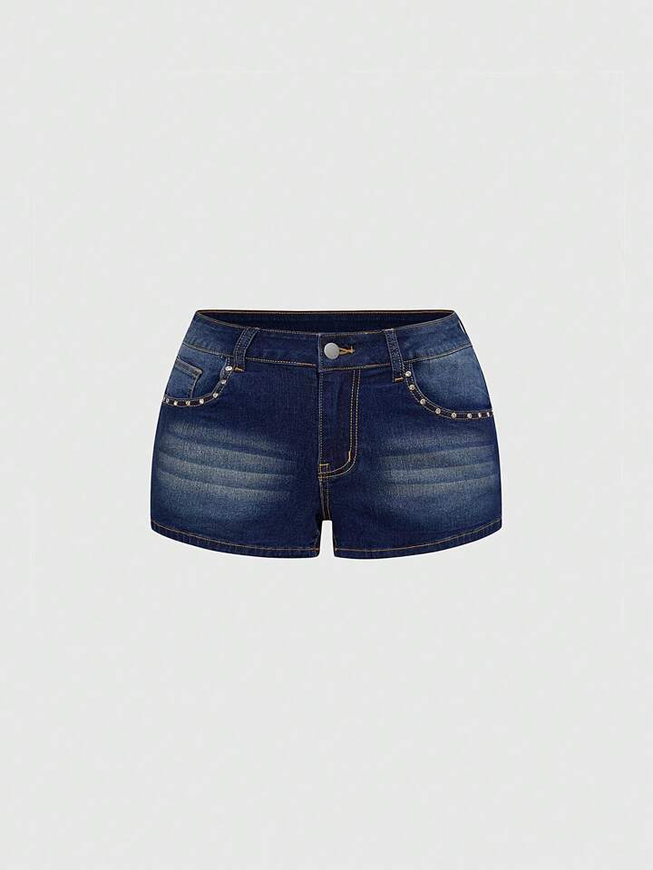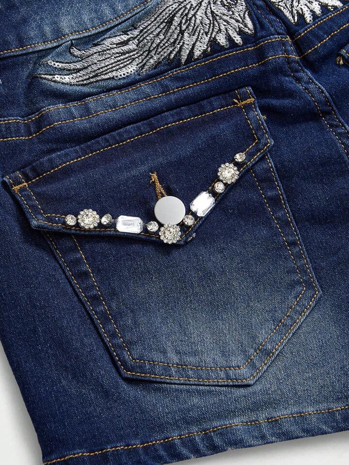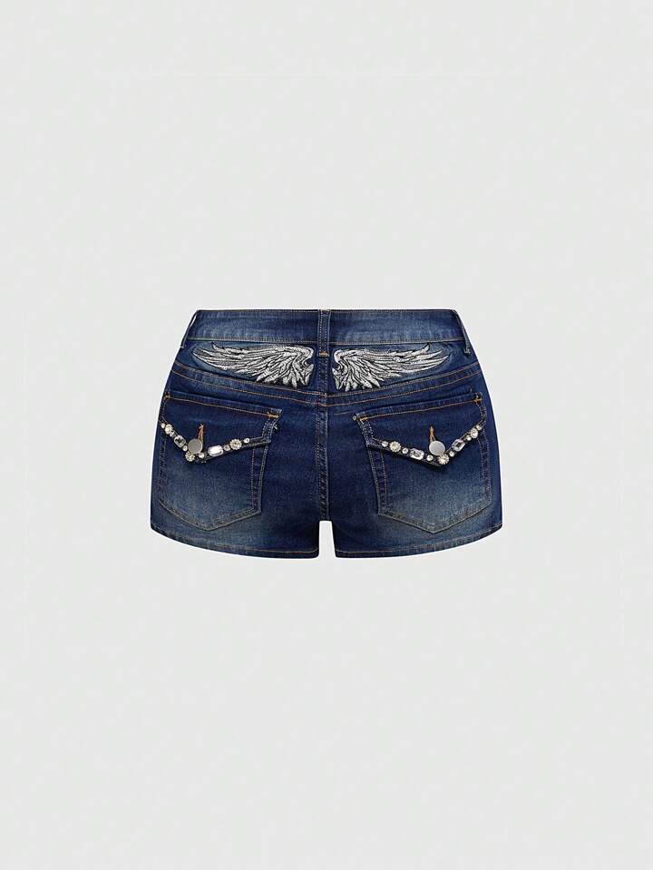 Grunge Punk Shorts in jeans mini con vita ultra bassa, effetto vissuto, con ricamo a forma di ali sul retro e strass, che rivelano il girovita in modo sexy