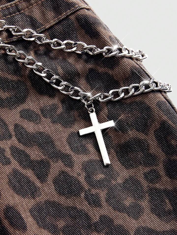 Grunge Punk Gonna di jeans mini sexy e alla moda da donna, ispirata allo stile vintage Y2K, con stampa leopardata e decorazioni a catena a croce
