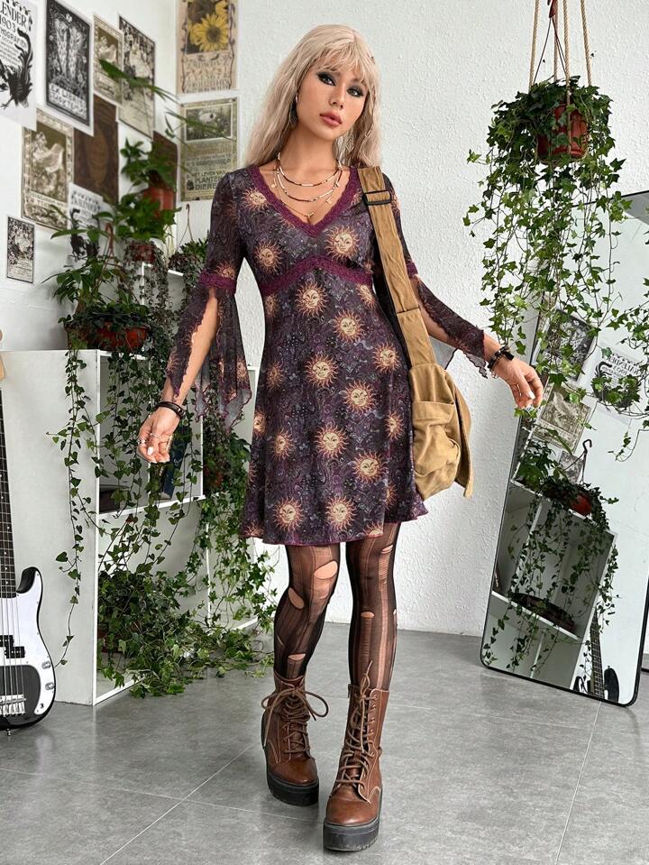Abiti in grunge con stampa sole pizzo a contrasto maniche a fessura