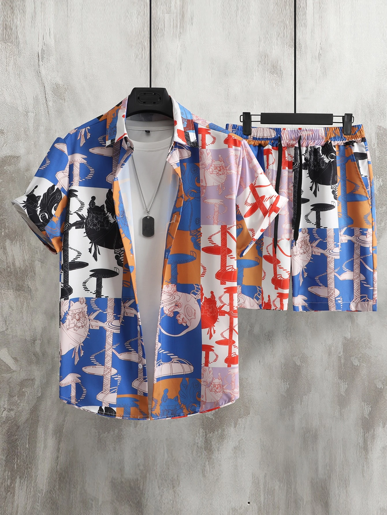 Uomo color block con stampa gatto Camicia & Shorts senza maglietta