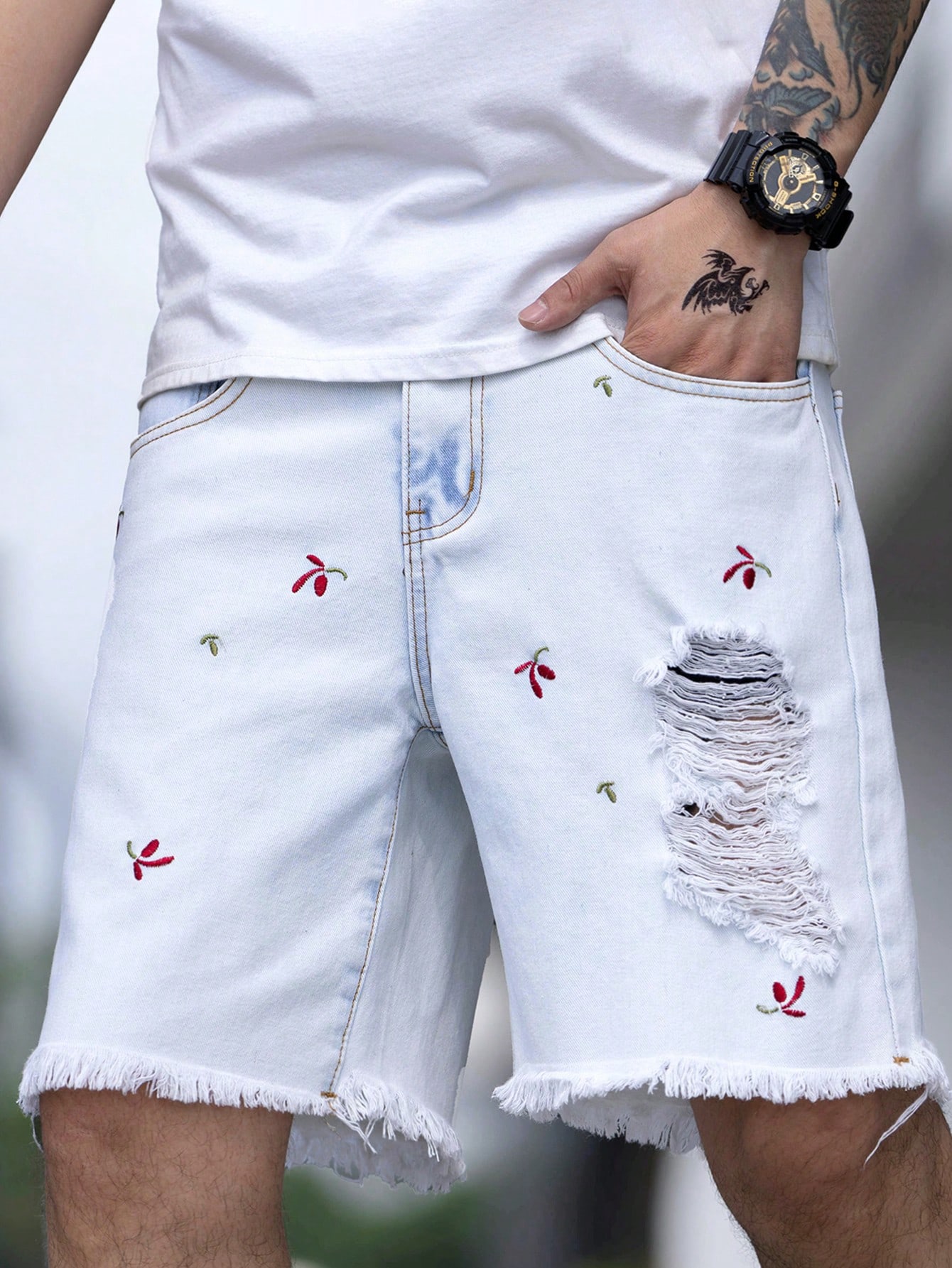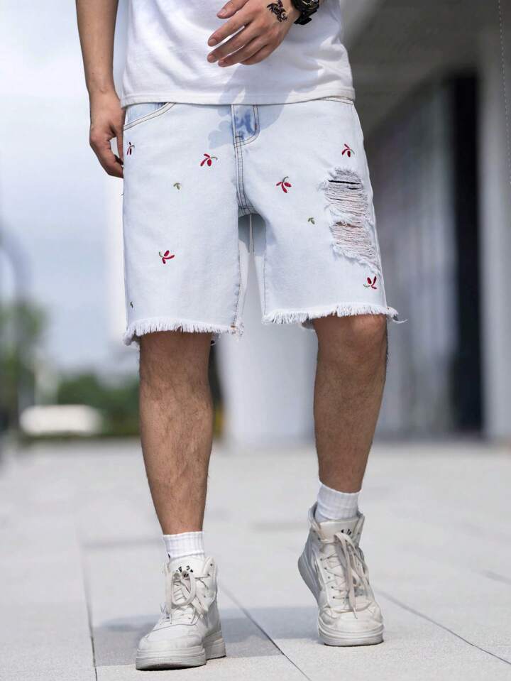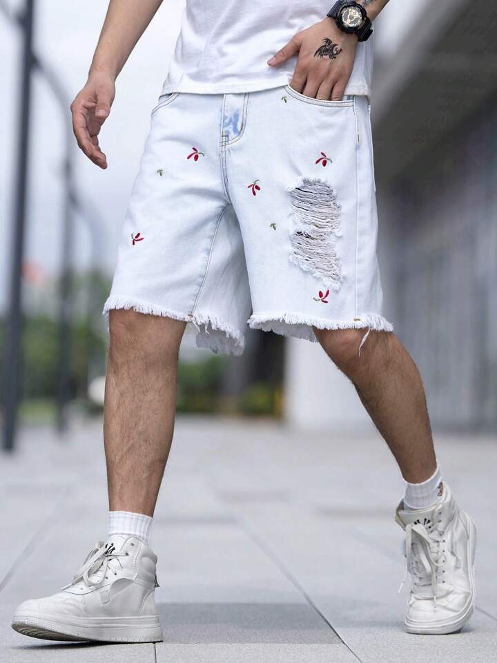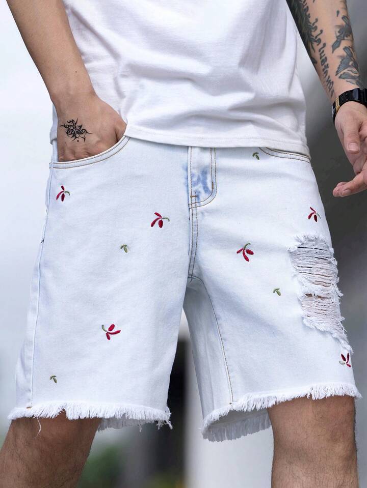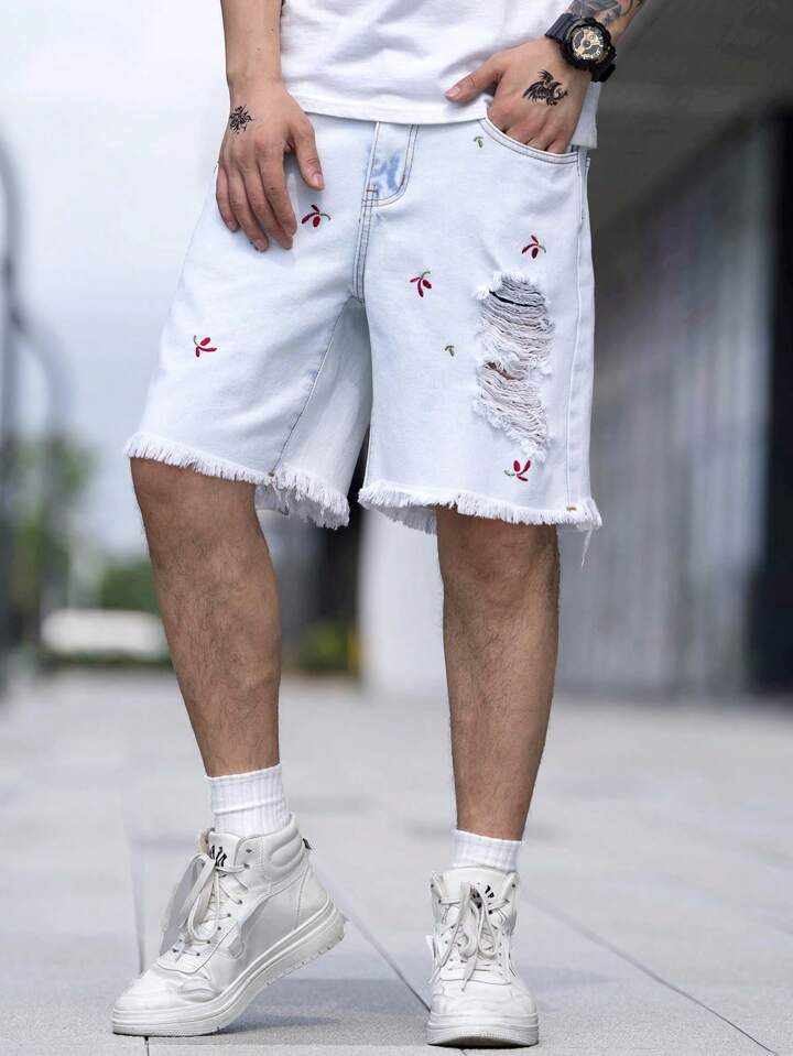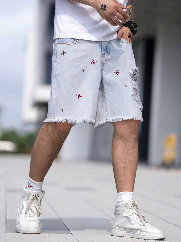 Uomo Shorts in denim con orlo grezzo strappato cotone con ricamo