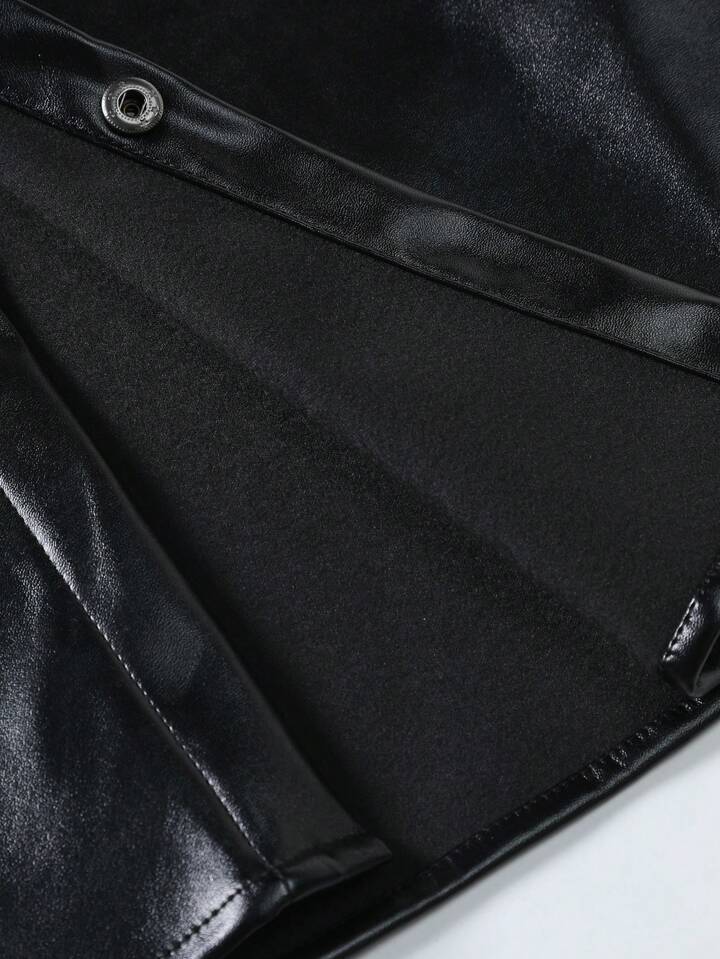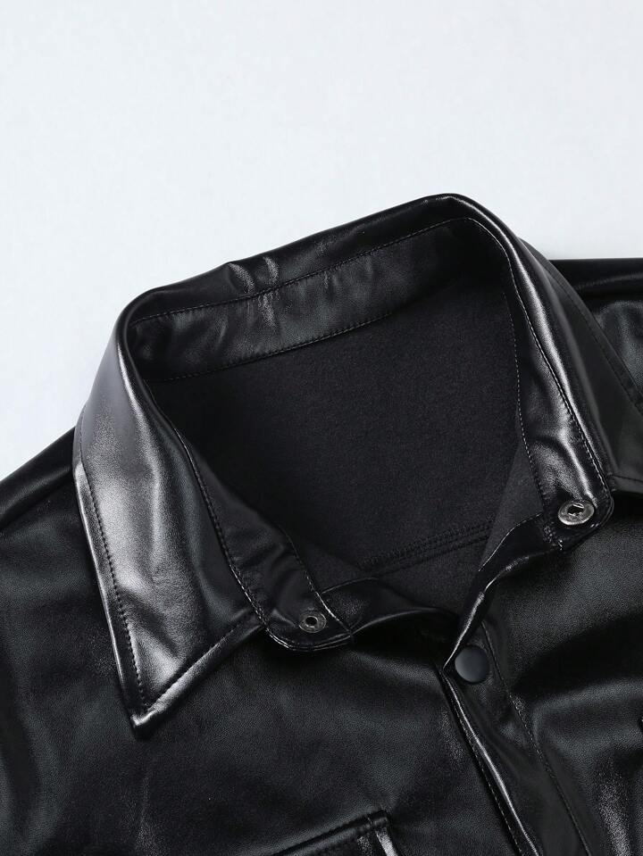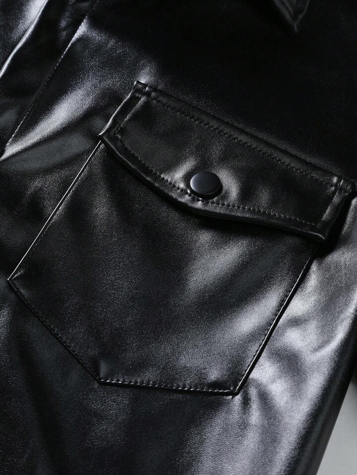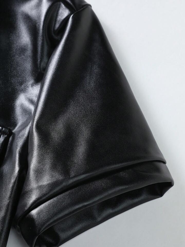 Uomo Maglietta Nera In Pelle PU Con Tasca Aletta Senza Maglietta Sotto, Maglietta Nera Semplice Manica Corta Button Up Stile Largo