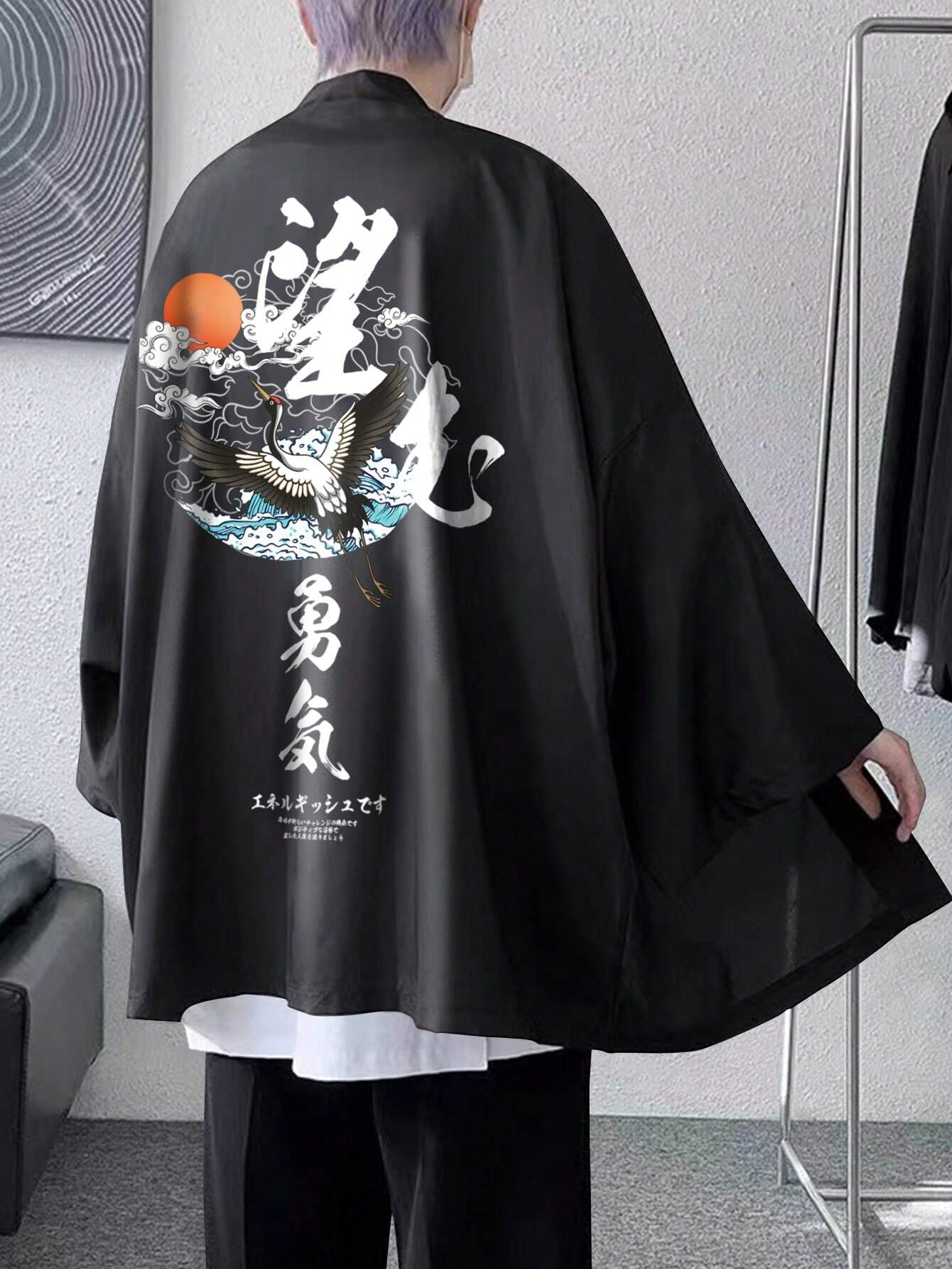 Kimono Oversize Con Stampa Giapponese Di Lettere E Onde, Con Spalle Basse E Senza T-shirt Per Uomo