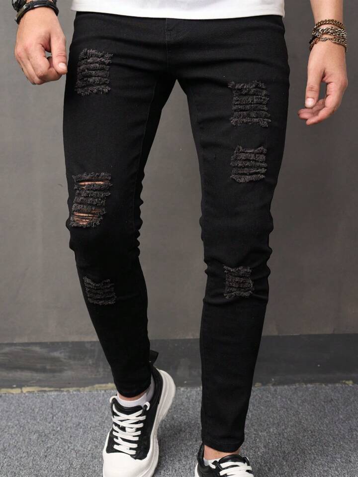 Jeans skinny strappati da uomo, aderenti e frangiati, in nero semplice con tasconi lunghi adatto per vacanza e abbigliamento da strada tra amici
