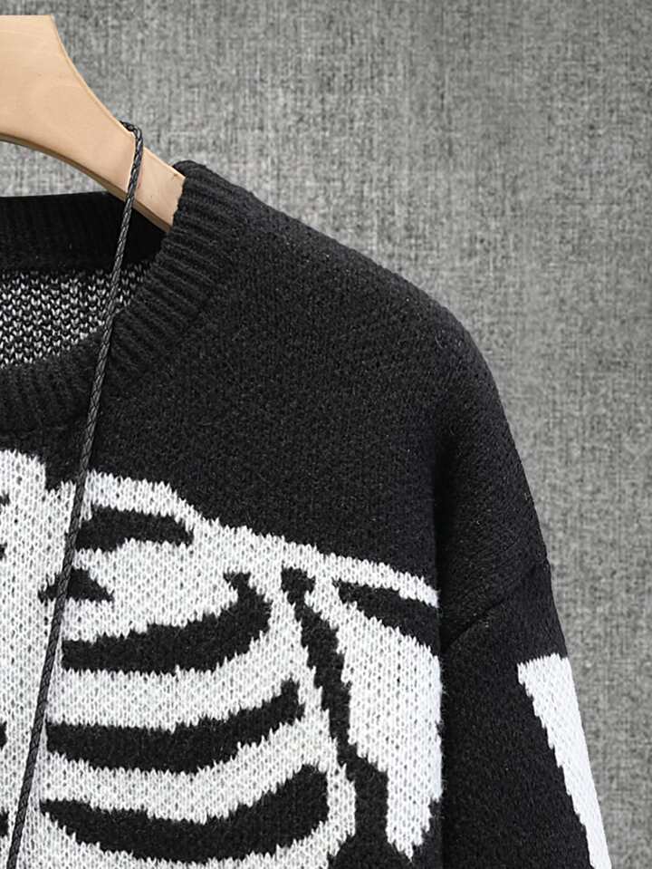 Maglione a maniche lunghe casual da uomo con grafica a blocchi di colore e motivo scheletrico, stile urban streetwear, maglione autunnale/invernale da Ognissanti, adatto per amici, stile grunge