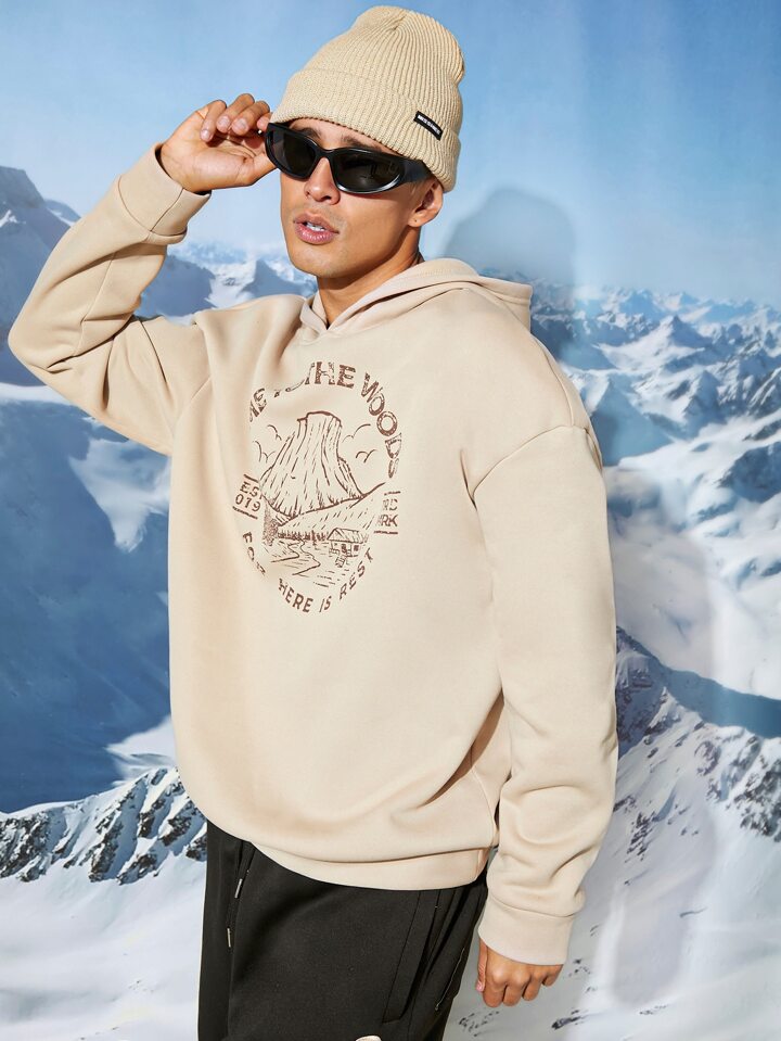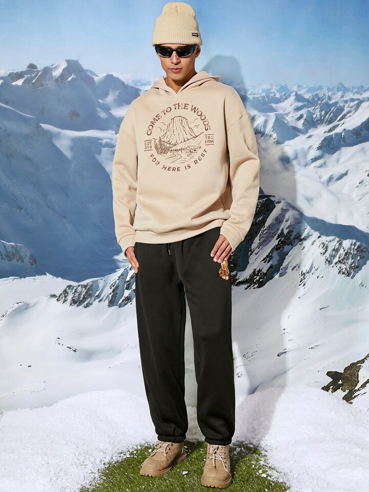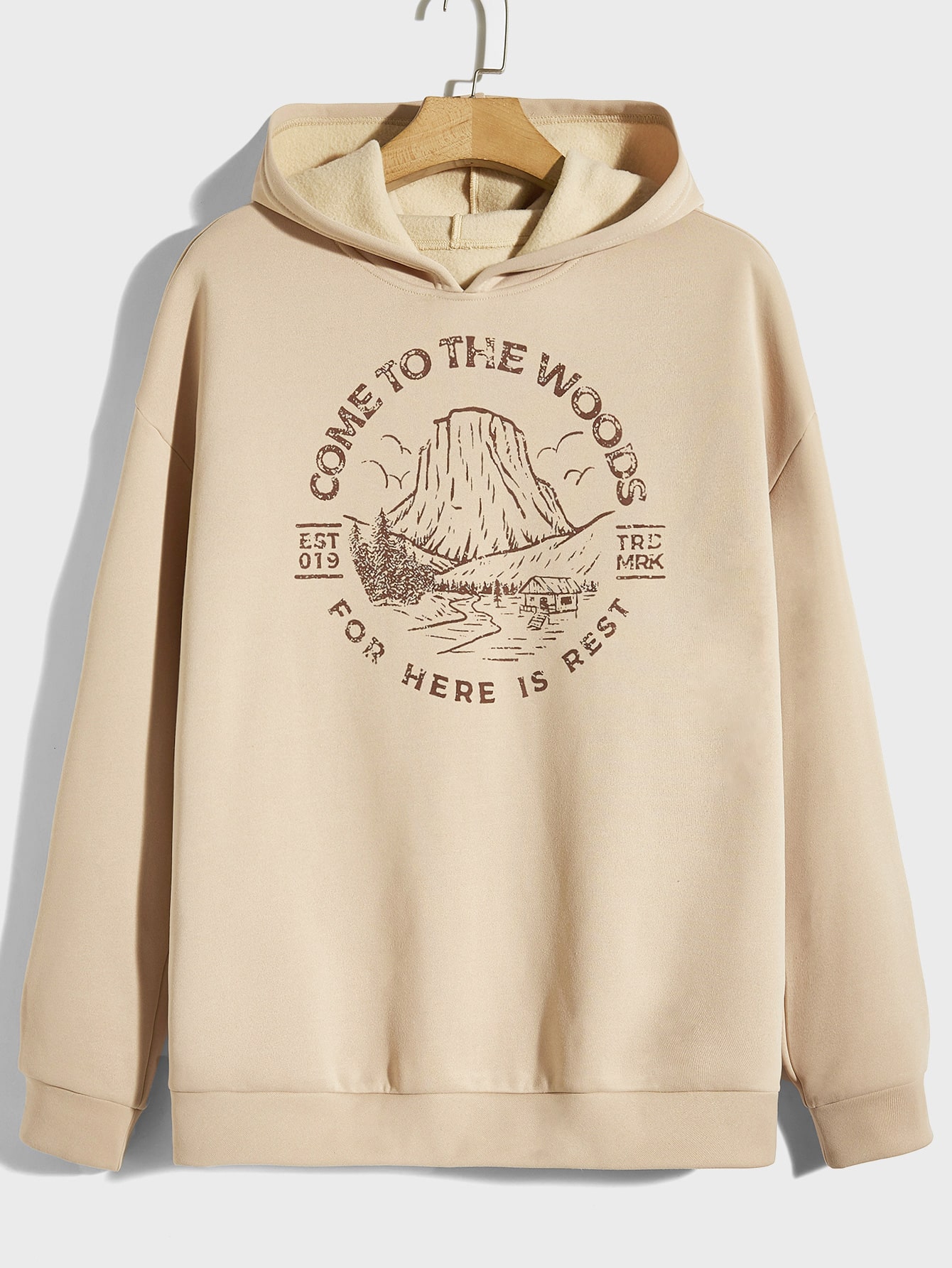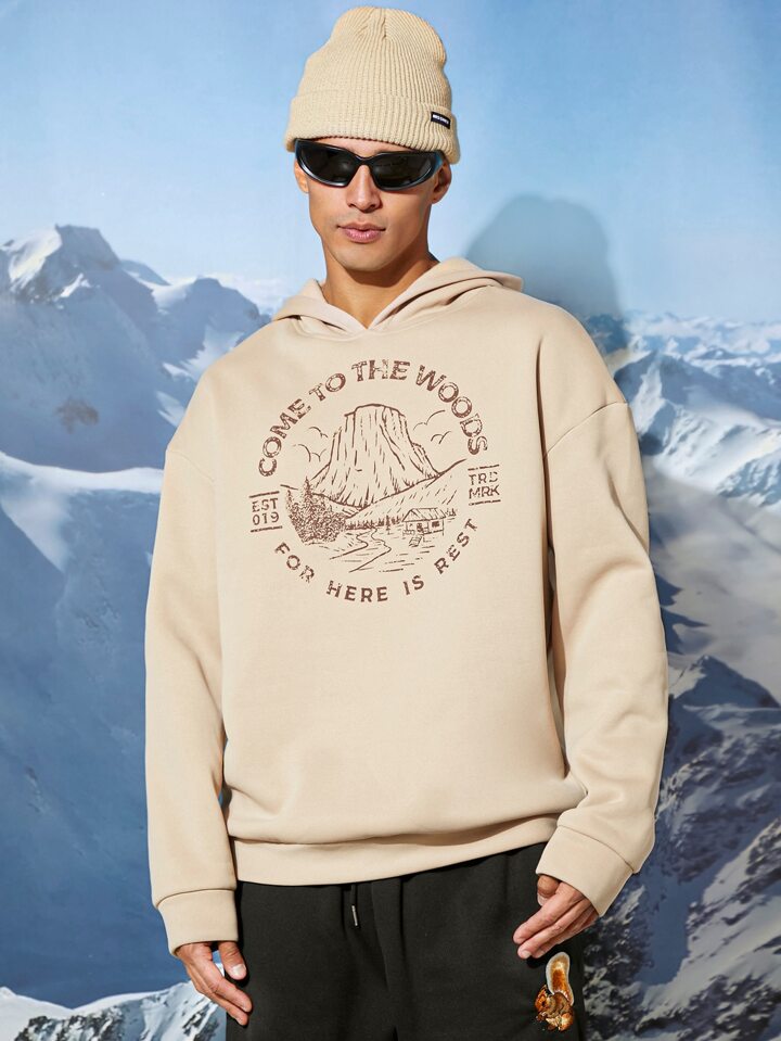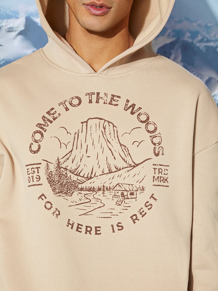 uomo Felpa con cappuccio slogan & con stampa montagna spalle cadenti