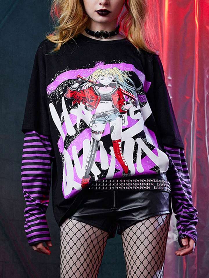 Harley Quinn | ROMWE Maglietta con stampa figura manica a righe