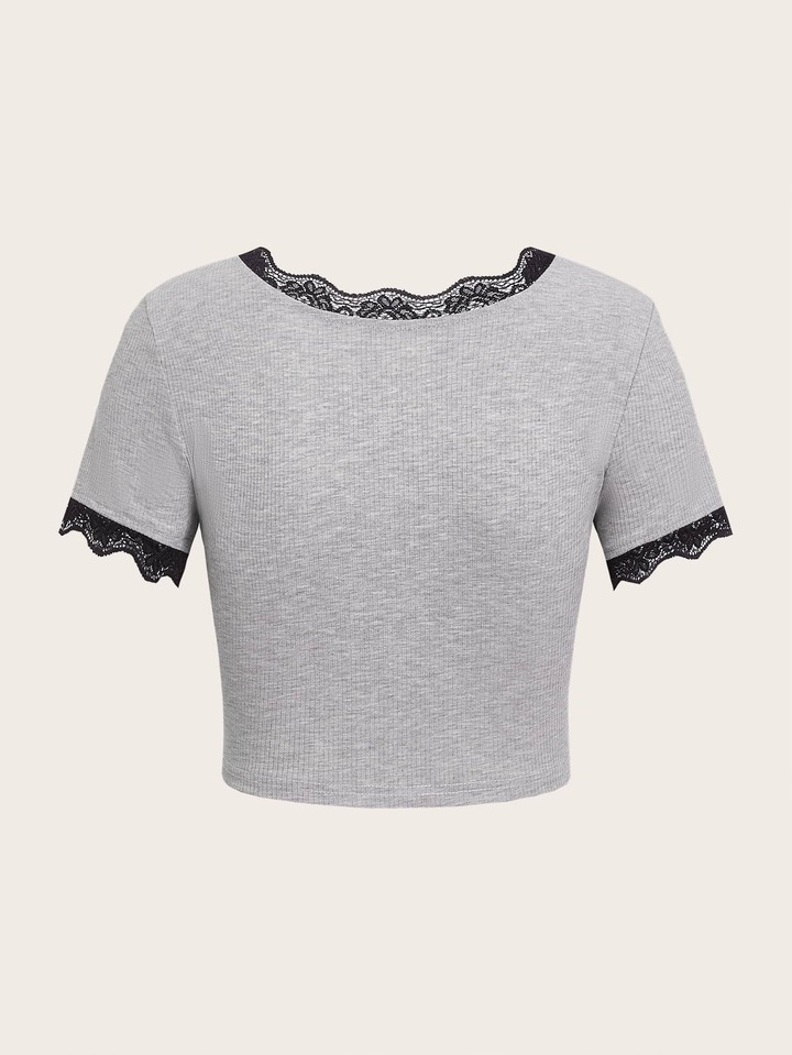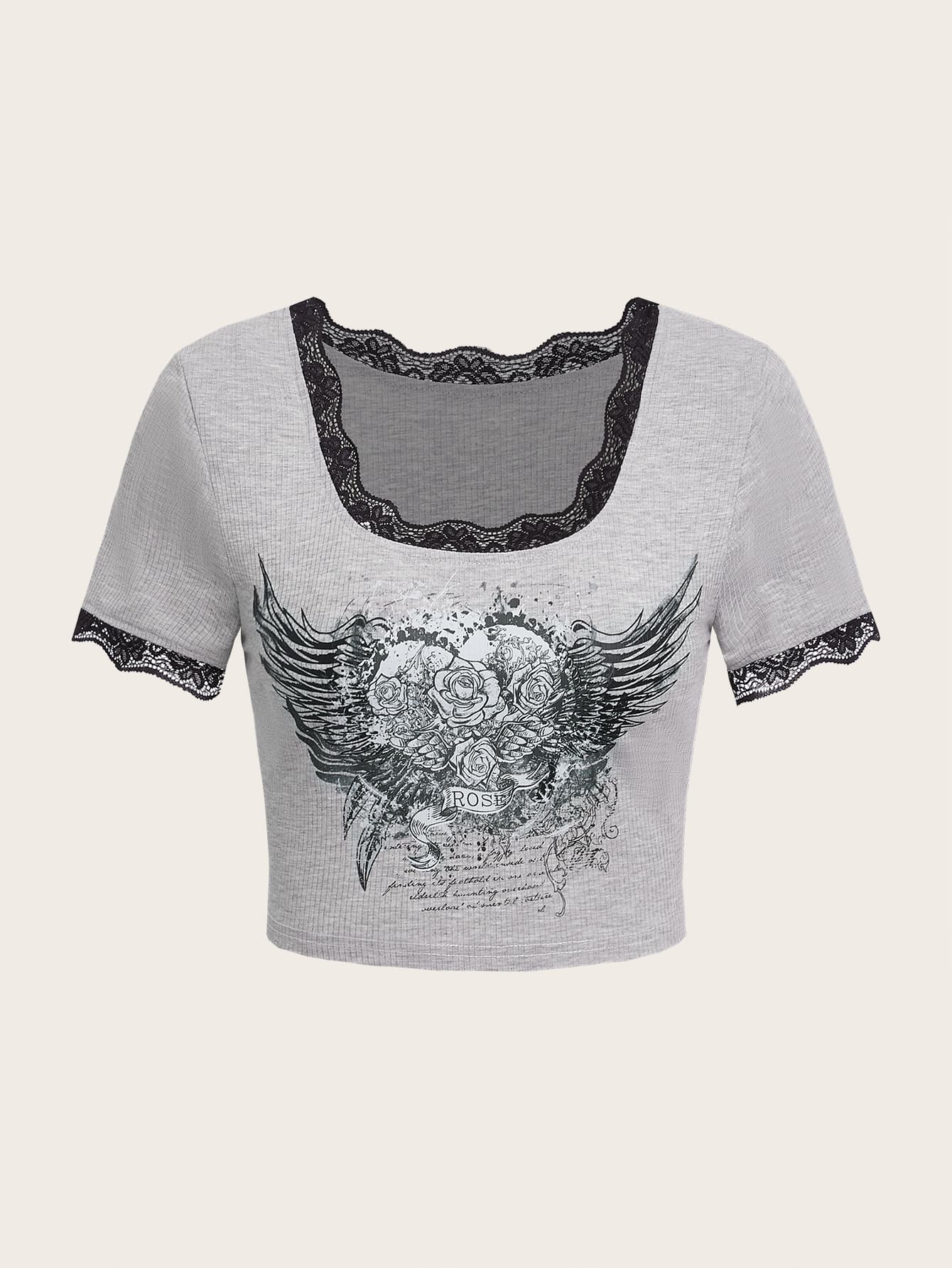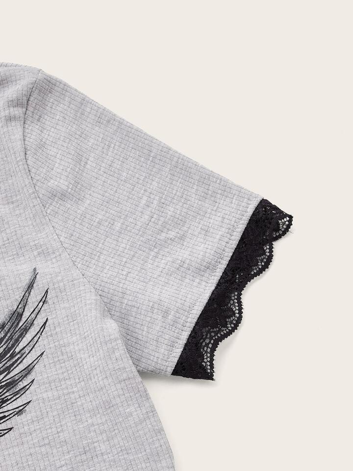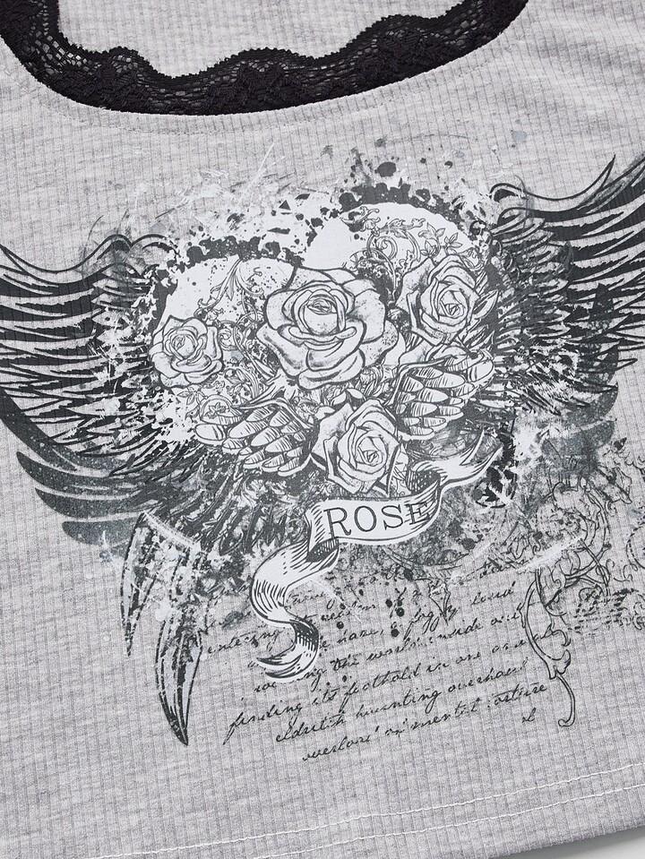 Maglietta cuore & ali grafico pizzo a contrasto